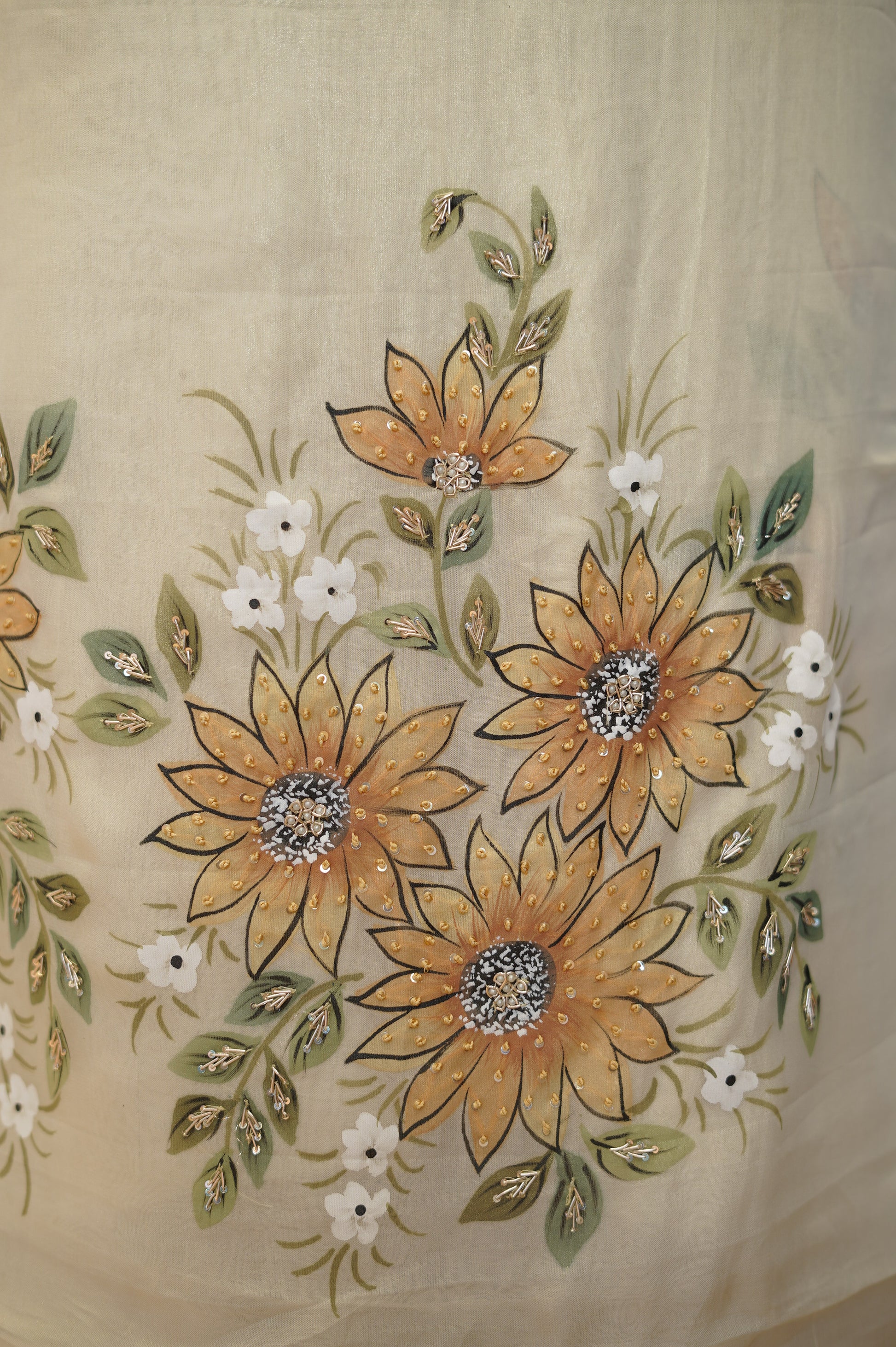 Elevate your style with this cream tissue organza suit, adorned with delicate handpainting for a unique, artisanal touch. The lightweight, ethereal fabric drapes gracefully, paired with a beautifully hand-painted dupatta to complete the sophisticated and artistic ensemble. Perfect for festive occasions, cultural events, or elegant daytime gatherings.