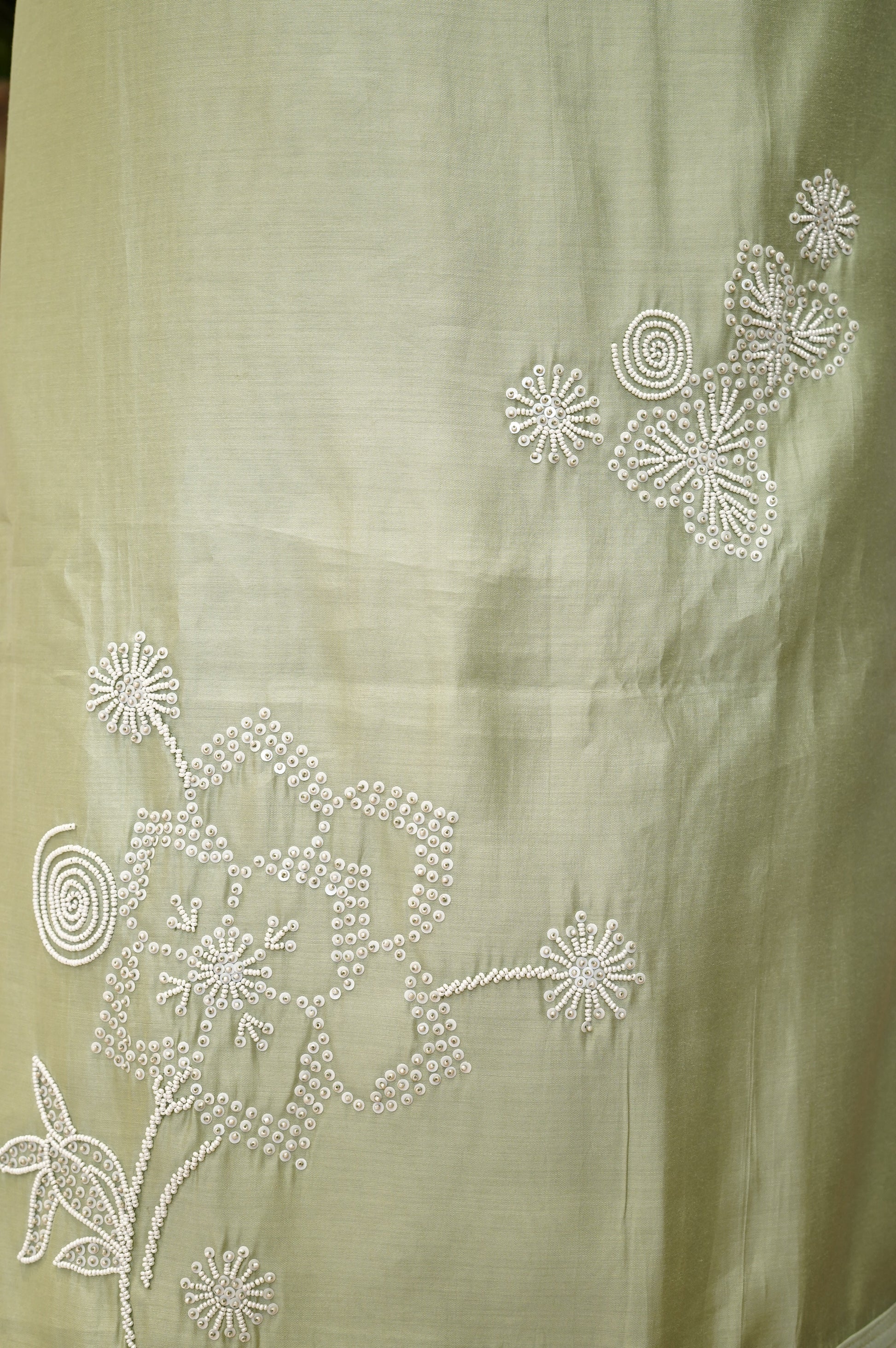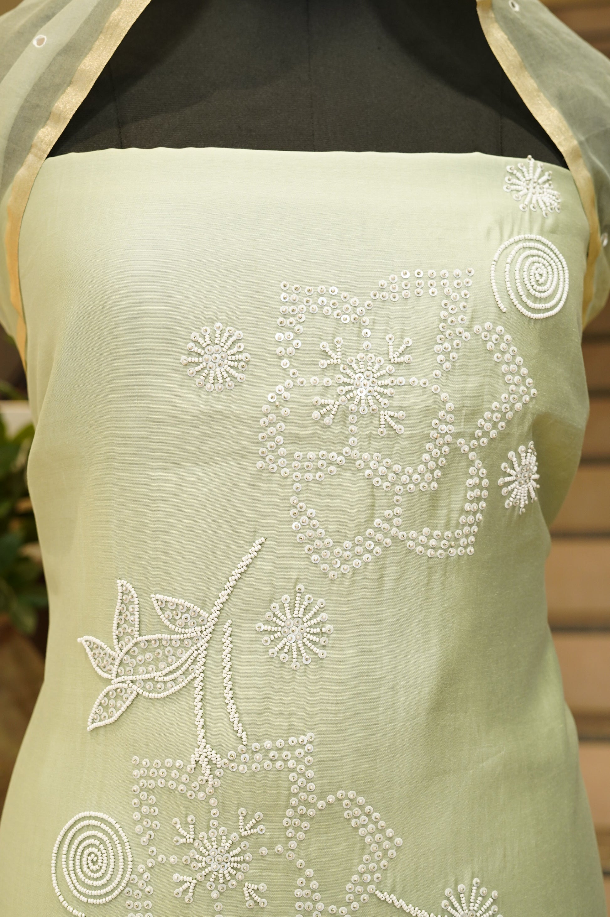 Step into graceful elegance with this Green Muslin Suit, featuring delicate handwork that adds artisanal charm and refined sophistication. Crafted from soft, breathable muslin fabric, the suit drapes effortlessly for a comfortable and graceful fit. It is paired with an organza dupatta, bringing a light, airy contrast and subtle texture to the ensemble. Perfect for festive occasions and special gatherings, this suit blends timeless craftsmanship with modern elegance.