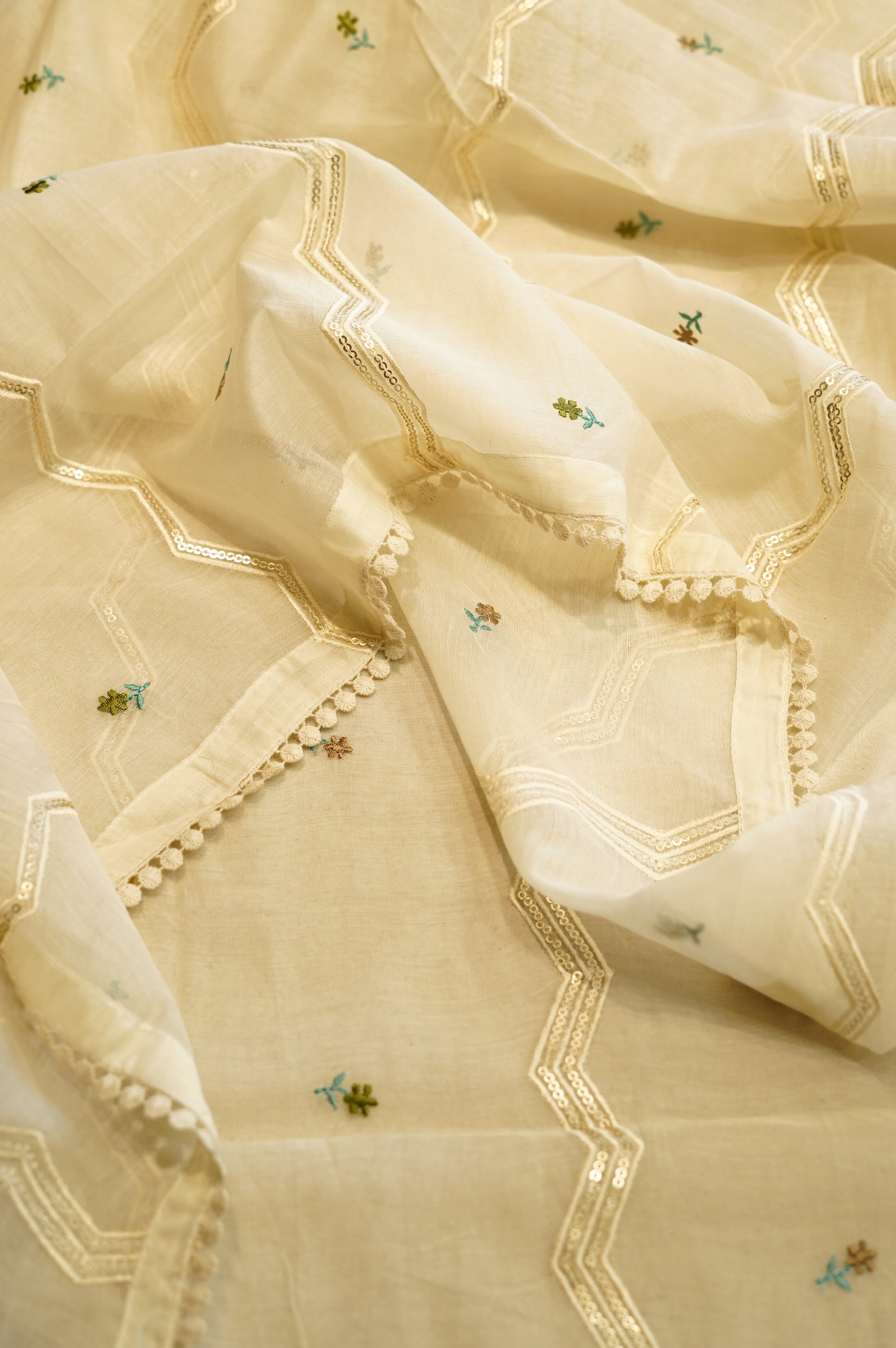 Exude timeless sophistication with this Off White Mul Chanderi Embroidered Suit, featuring delicate embroidery for an elegant and refined look. Crafted from soft, flowing Mul Chanderi fabric and paired with a matching embroidered Mul Chanderi dupatta, this ensemble offers a harmonious blend of grace and tradition—perfect for festive occasions and special gatherings.