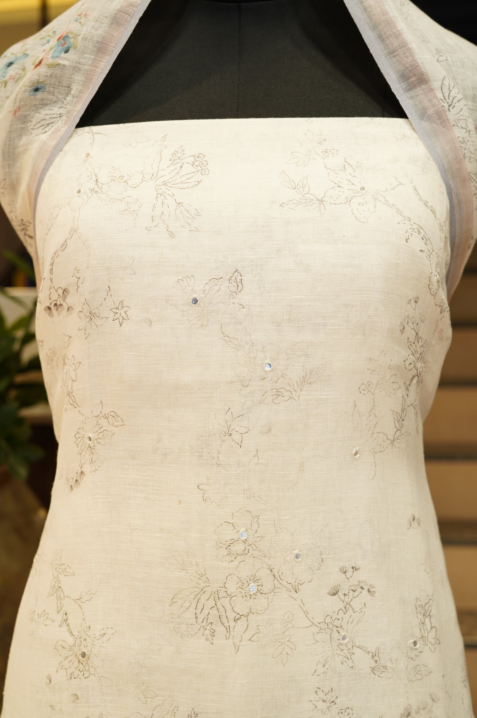 Embrace effortless charm with this Off White Pure Linen Floral Printed Suit, featuring delicate floral prints that add a touch of freshness and elegance. Crafted from soft, breathable pure linen, the suit offers a comfortable fit and graceful drape. It is paired with a matching printed linen dupatta, completing the ensemble with harmonious style. Perfect for casual gatherings and daytime occasions, this suit blends contemporary prints with everyday comfort.