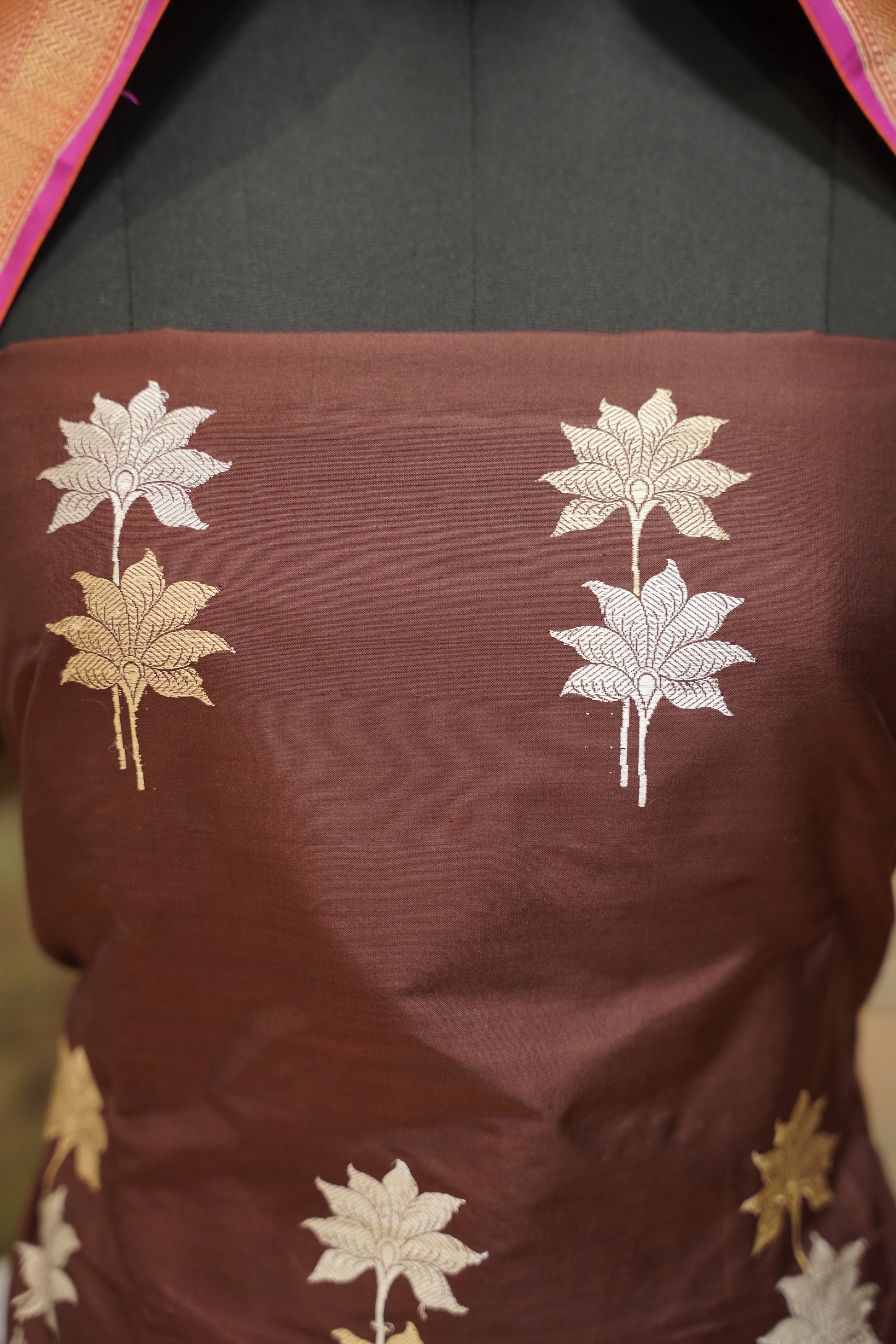 Exude regal elegance with this mehroon pure Kathan silk Banarasi suit, featuring intricate traditional patterns for a luxurious finish. Paired with a matching silk Banarasi dupatta, this ensemble is perfect for weddings, festive occasions, and grand celebrations.