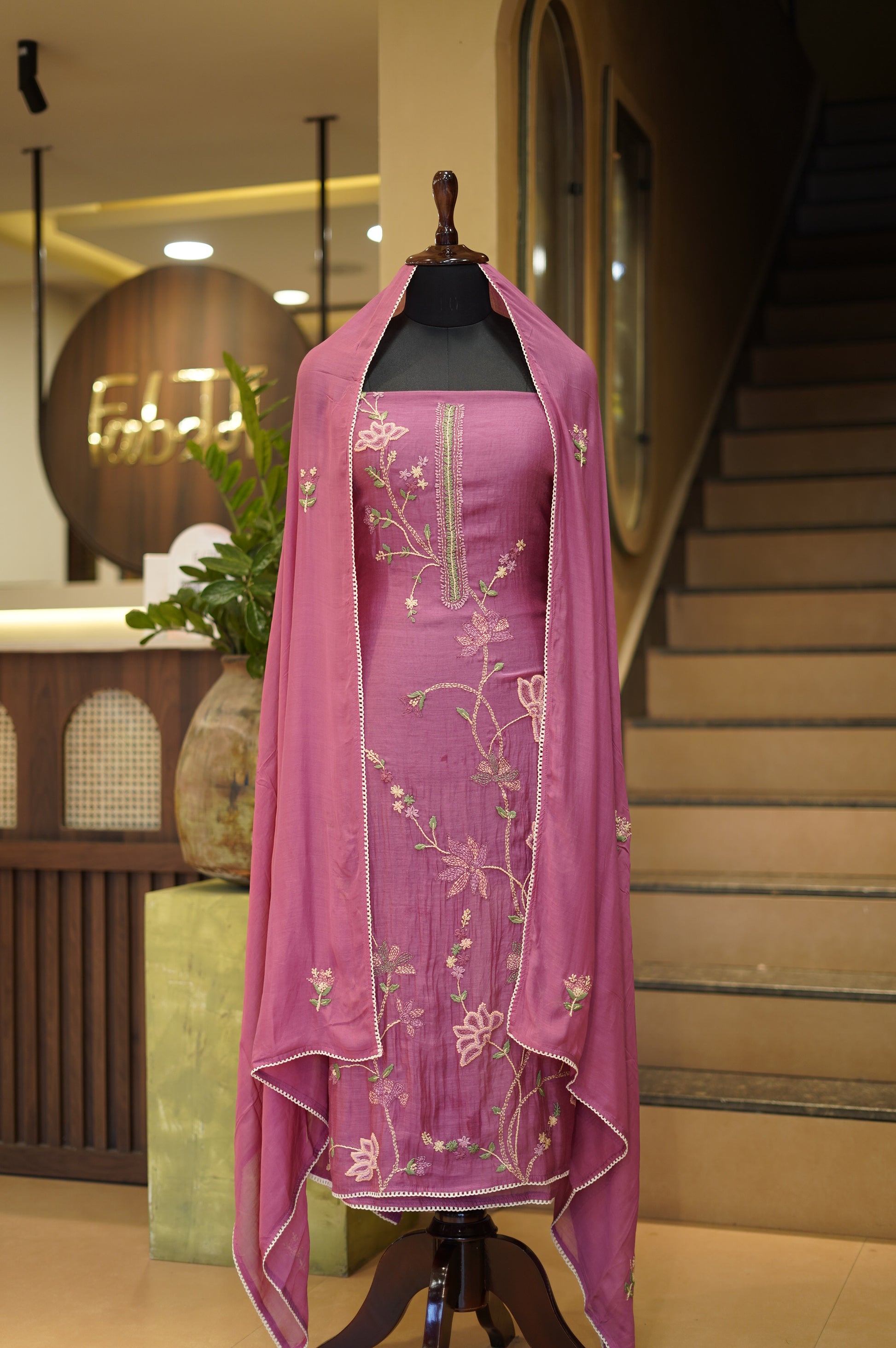 Wine Mul Chanderi Suit with Hand Embroidery