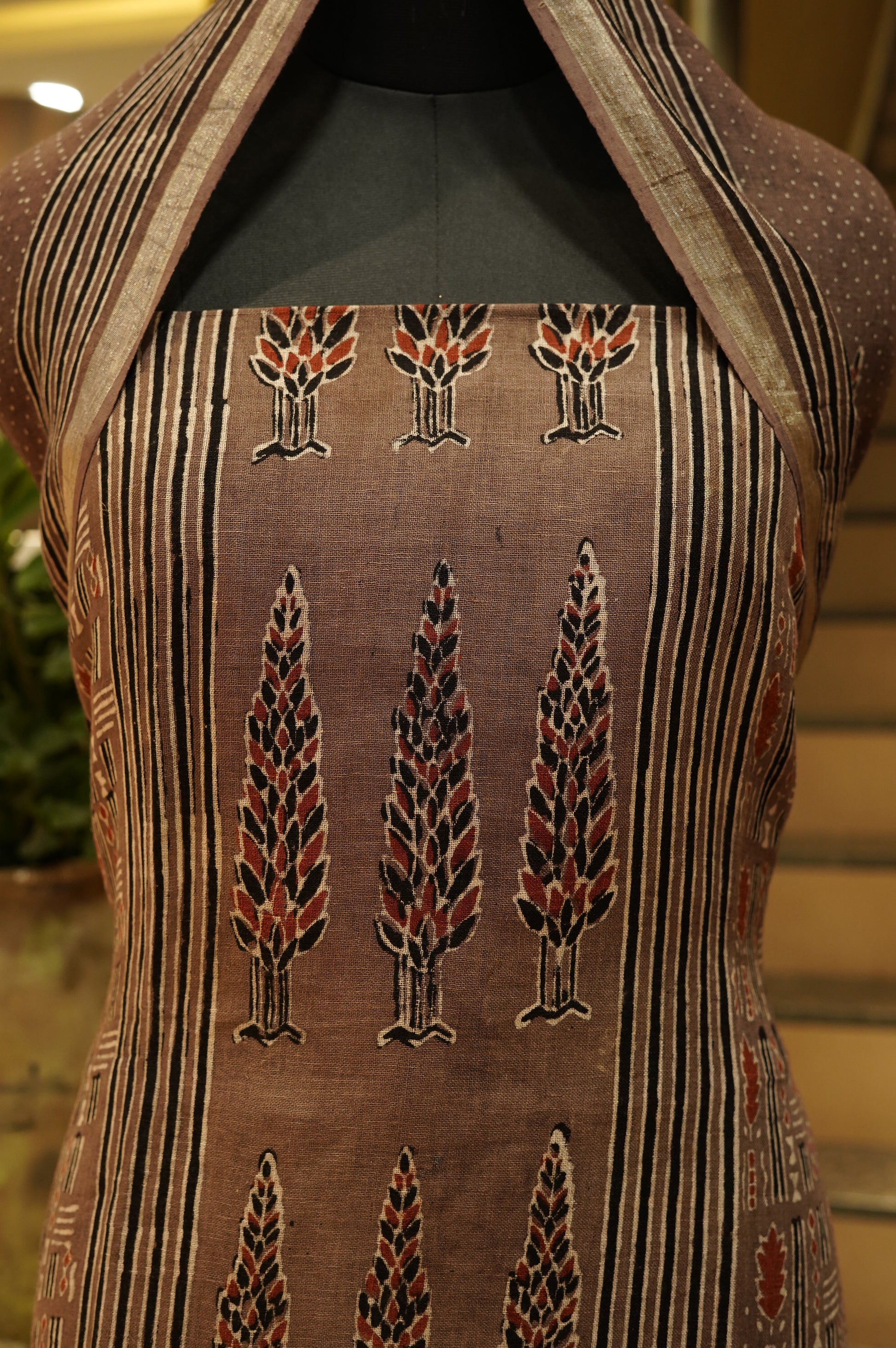 Step into timeless elegance with this Brown Pure Linen Ajrakh Suit, featuring traditional Ajrakh prints that showcase artisanal craftsmanship. Made from soft, breathable pure linen, the suit offers a comfortable fit and natural drape. It is paired with a matching linen Ajrakh dupatta, completing the ensemble with harmonious style. Perfect for casual gatherings and daytime occasions, this suit blends heritage artistry with modern comfort.
