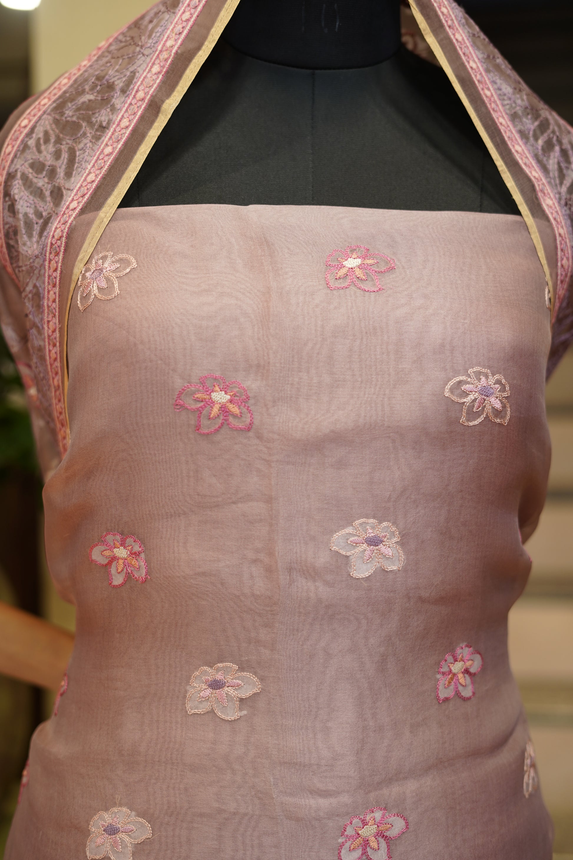 Wine Pure Organza Suit with Embroidery