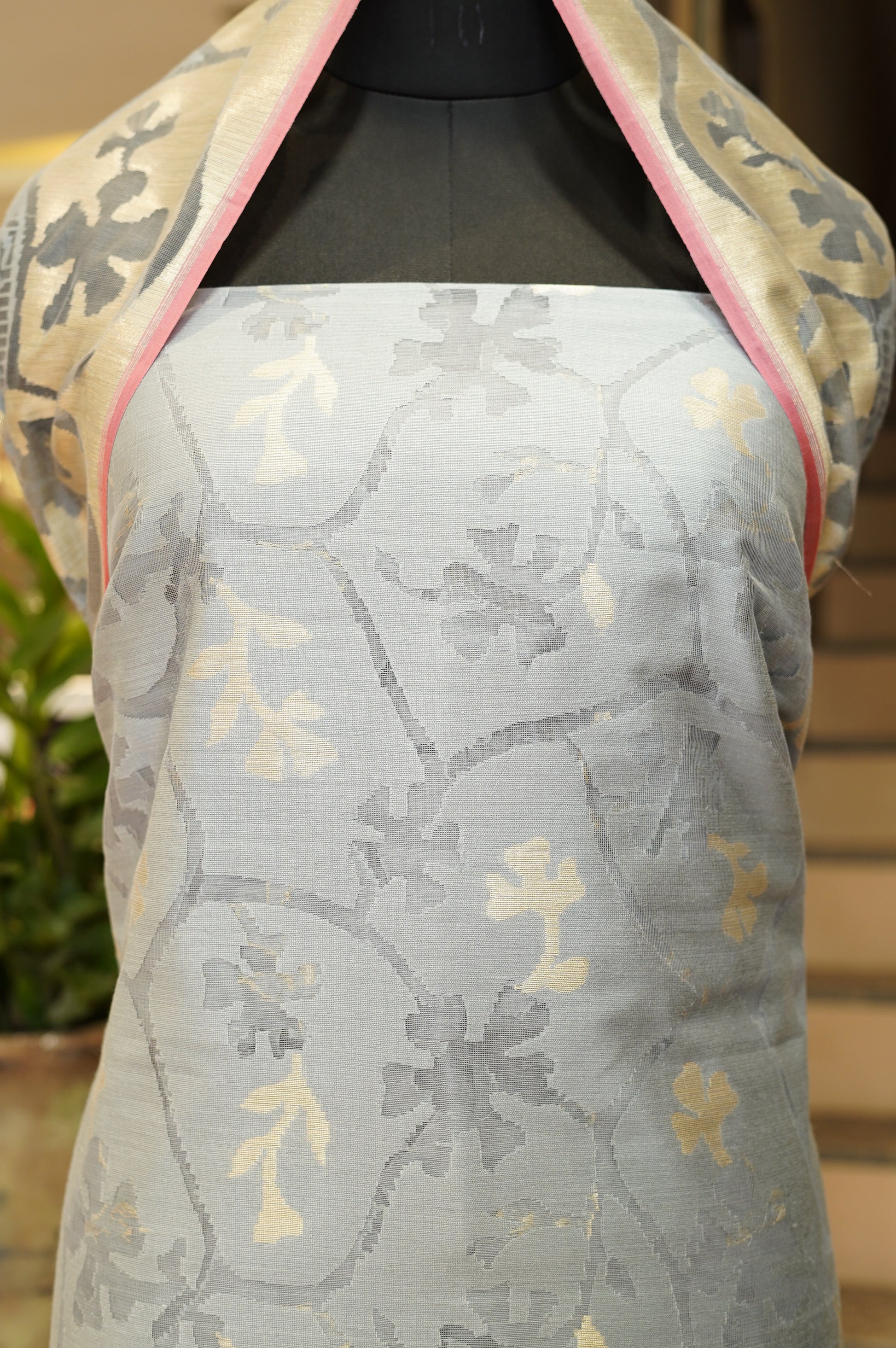 Exude understated elegance with this Grey Pure Tussar Silk Jamdani Suit, adorned with intricate Jamdani weaving that adds timeless charm and artisanal detail. Crafted from luxurious pure Tussar silk, the suit offers a graceful drape and rich texture. It is paired with a matching Tussar Jamdani dupatta, completing the ensemble with refined sophistication. Perfect for festive occasions and special gatherings, this suit blends heritage craftsmanship with modern elegance.