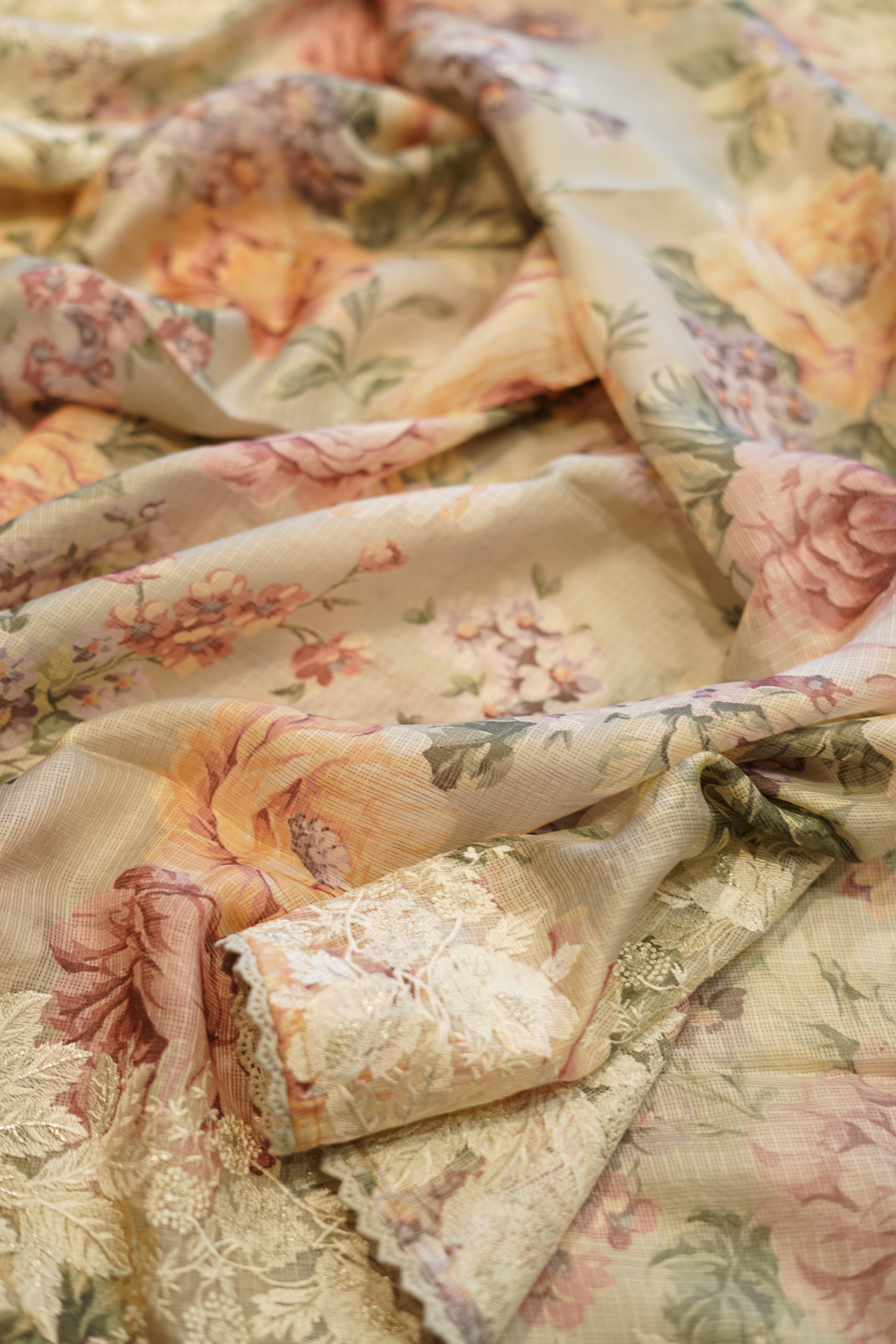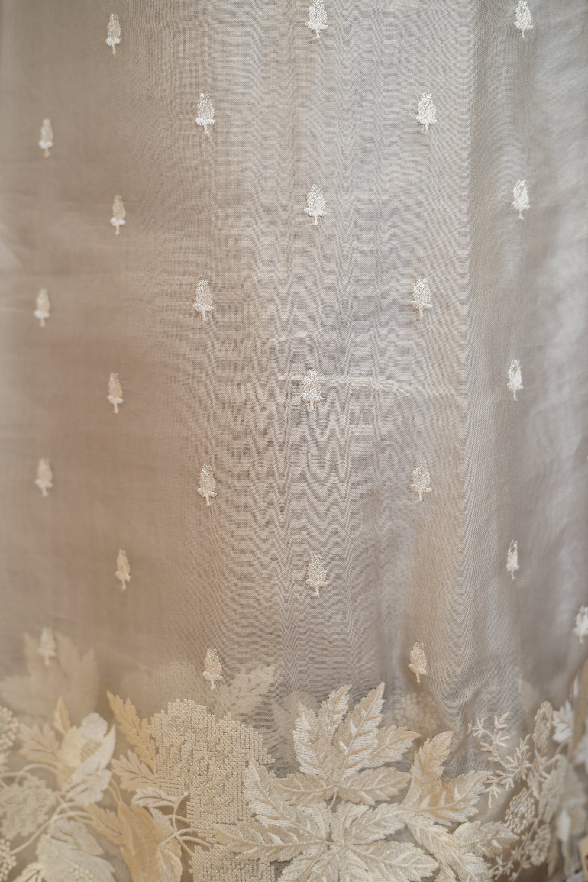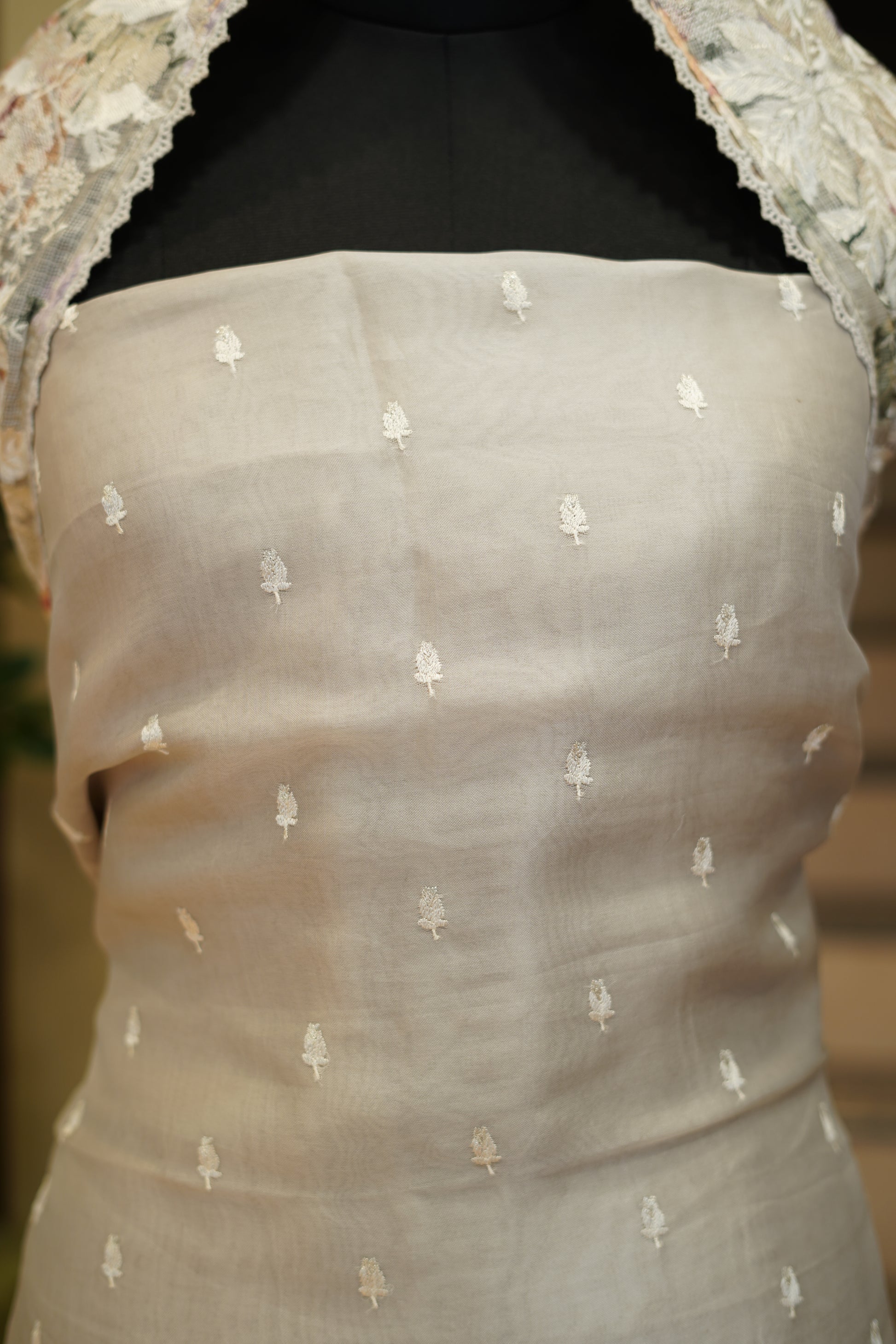 Step into effortless elegance with this English Grey Pure Silk Organza Suit, delicately enhanced with refined embroidery. Paired with a pure Kota silk dupatta featuring intricate embroidered details, this ensemble offers a sophisticated blend of texture and craftsmanship—ideal for festive occasions and special celebrations.