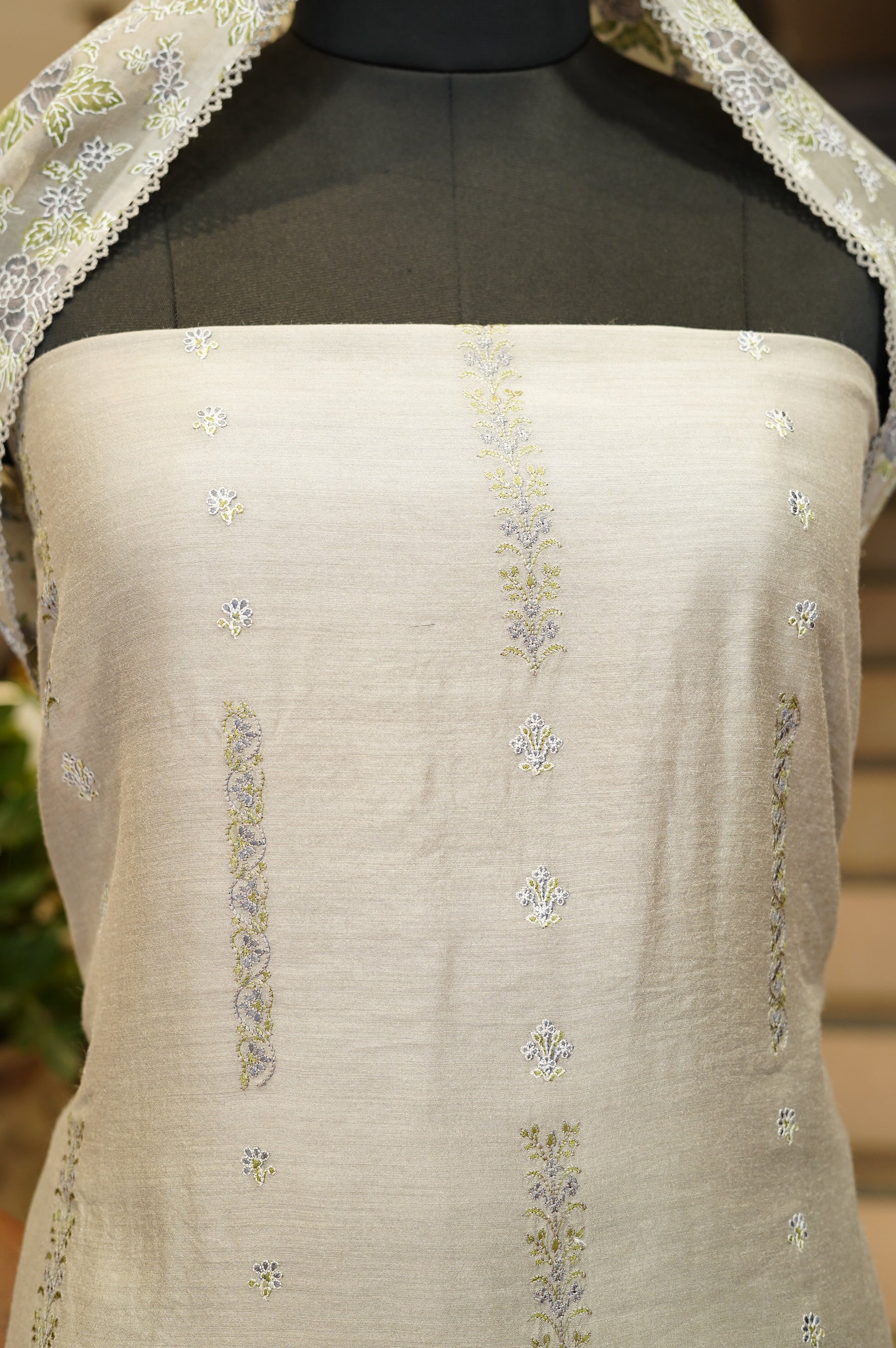 Grey Pure Muga Silk Suit with Embroidery