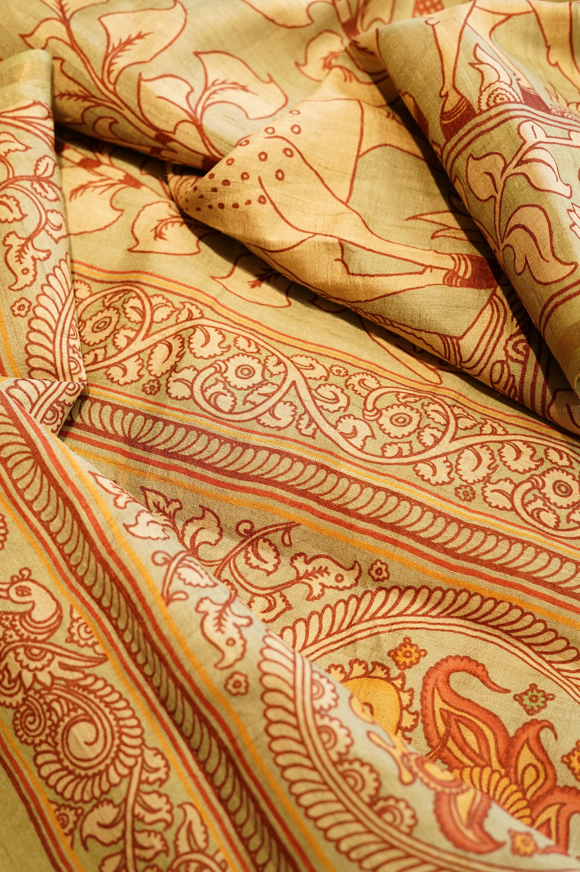 Embrace timeless elegance with this Green Pure Tussar Silk Suit, featuring subtle self zari weaving that adds a touch of sophistication. Crafted from luxurious Tussar silk, it is paired with a printed Tussar dupatta for a graceful contrast—perfect for festive occasions and traditional celebrations.