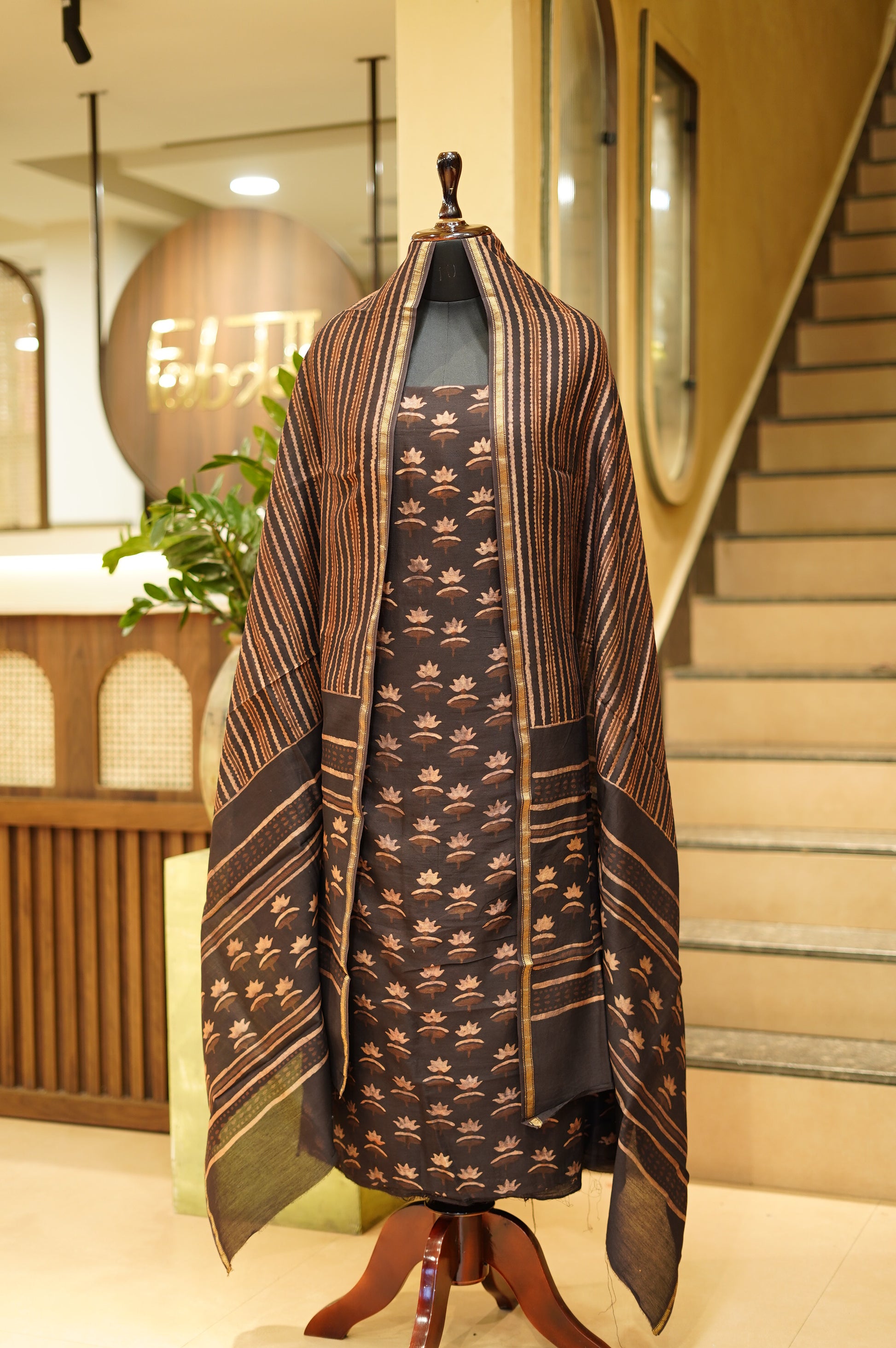Exude classic elegance with this Black Maheshwari Ajrakh Suit, featuring traditional Ajrakh prints for a refined and artisanal touch. Crafted from soft Maheshwari fabric and paired with a matching printed Maheshwari dupatta, this ensemble is perfect for festive occasions and sophisticated ethnic gatherings.