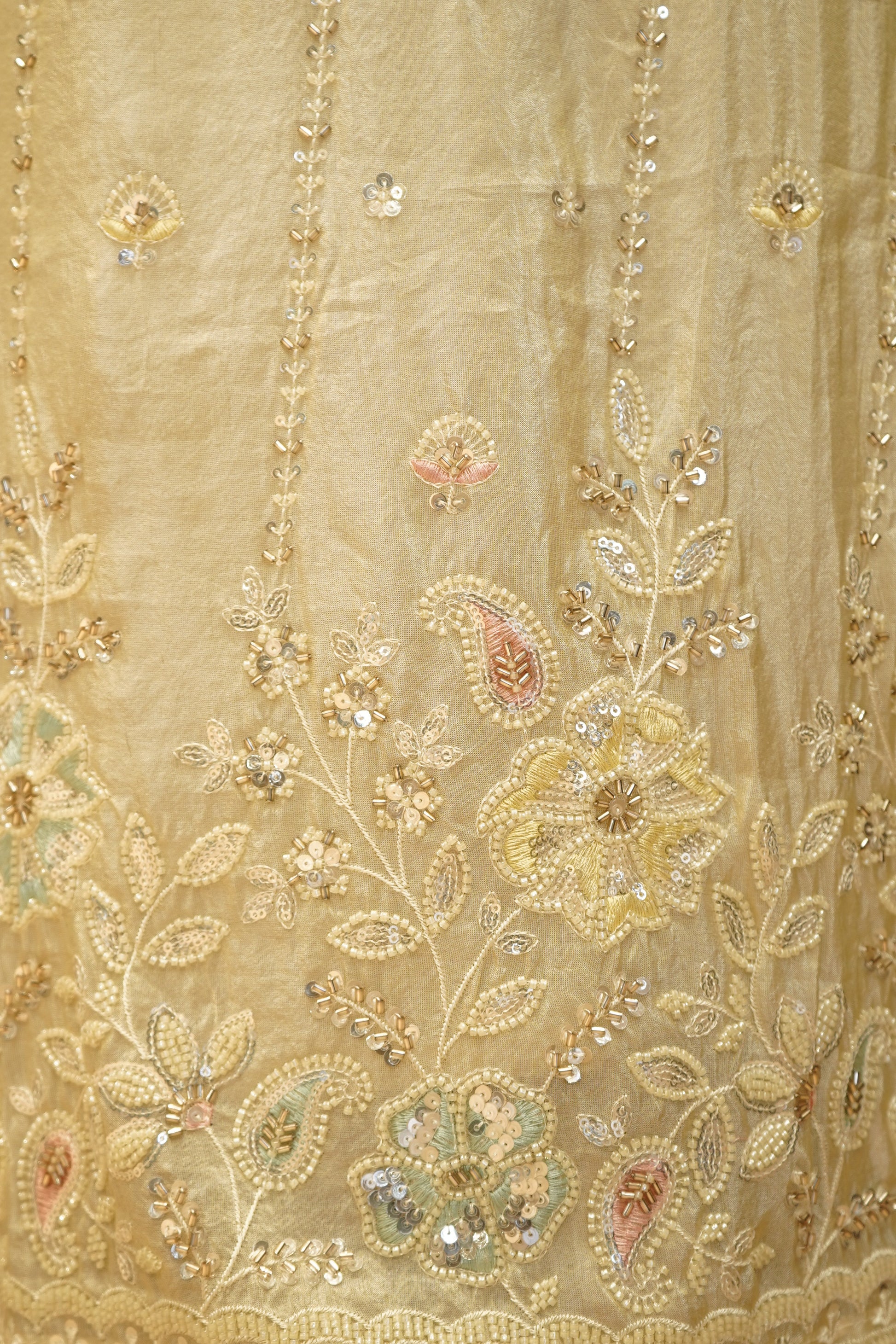Radiate sophistication with this stunning ivory tissue suit, featuring intricate bead handwork that adds a touch of shimmer and elegance. Paired with a matching beads work dupatta, this ensemble is perfect for festive occasions, formal gatherings, and timeless celebrations.