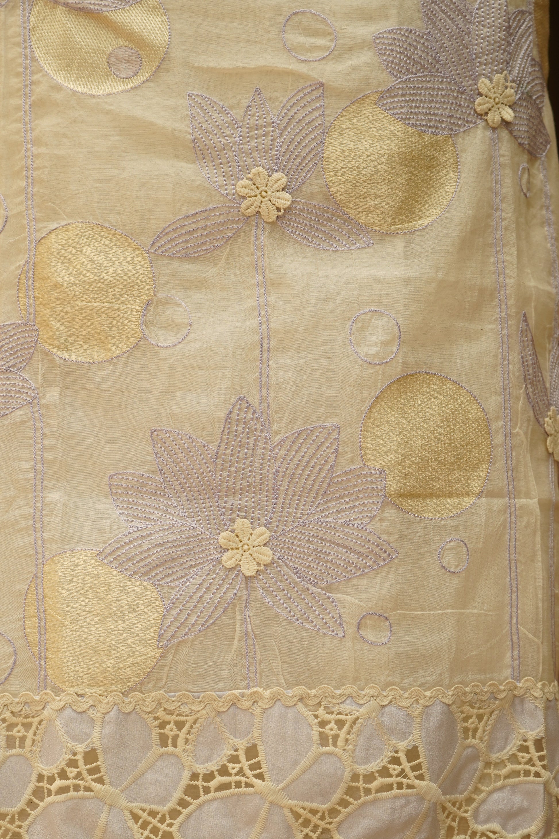 Radiate refined elegance with this off-white Mul Chanderi suit, featuring intricate applique embroidery that adds a touch of sophistication. Paired with a beautifully crafted applique embroidered Chanderi dupatta, this ensemble is perfect for festive occasions, formal gatherings, or timeless everyday grace.