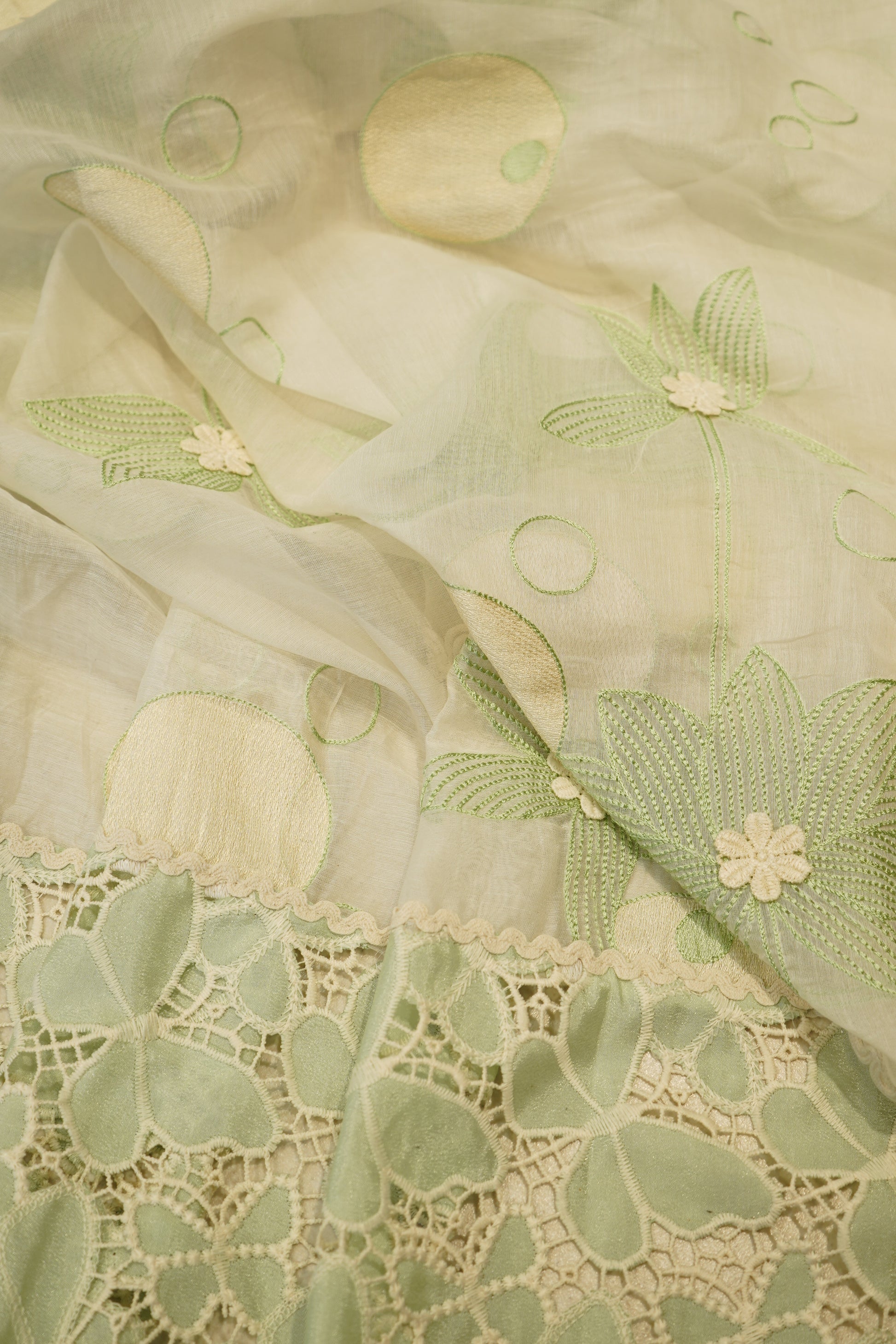 Exude subtle elegance with this off-white Mul Chanderi unstitched suit, beautifully adorned with delicate applique embroidery. The ensemble is paired with a matching Chanderi dupatta featuring exquisite applique detailing, creating a timeless and graceful look perfect for festive and formal occasions.