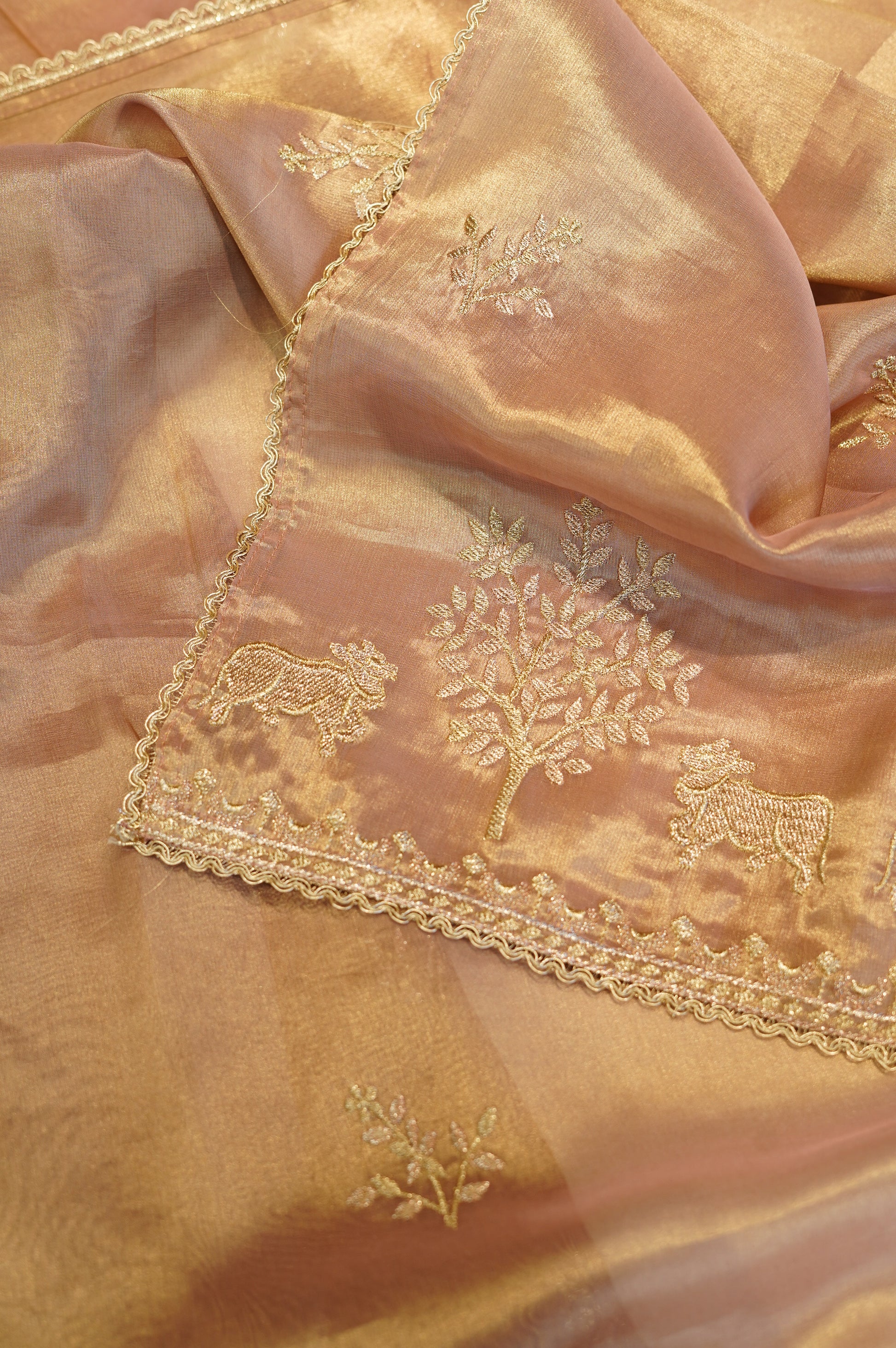 Step into subtle elegance with this dusty brown tissue suit, adorned with intricate embroidery for a refined, handcrafted finish. The lightweight, lustrous fabric drapes beautifully and is paired with a matching embroidered tissue dupatta, creating a sophisticated ensemble perfect for festive occasions, celebrations, or elegant daytime wear.