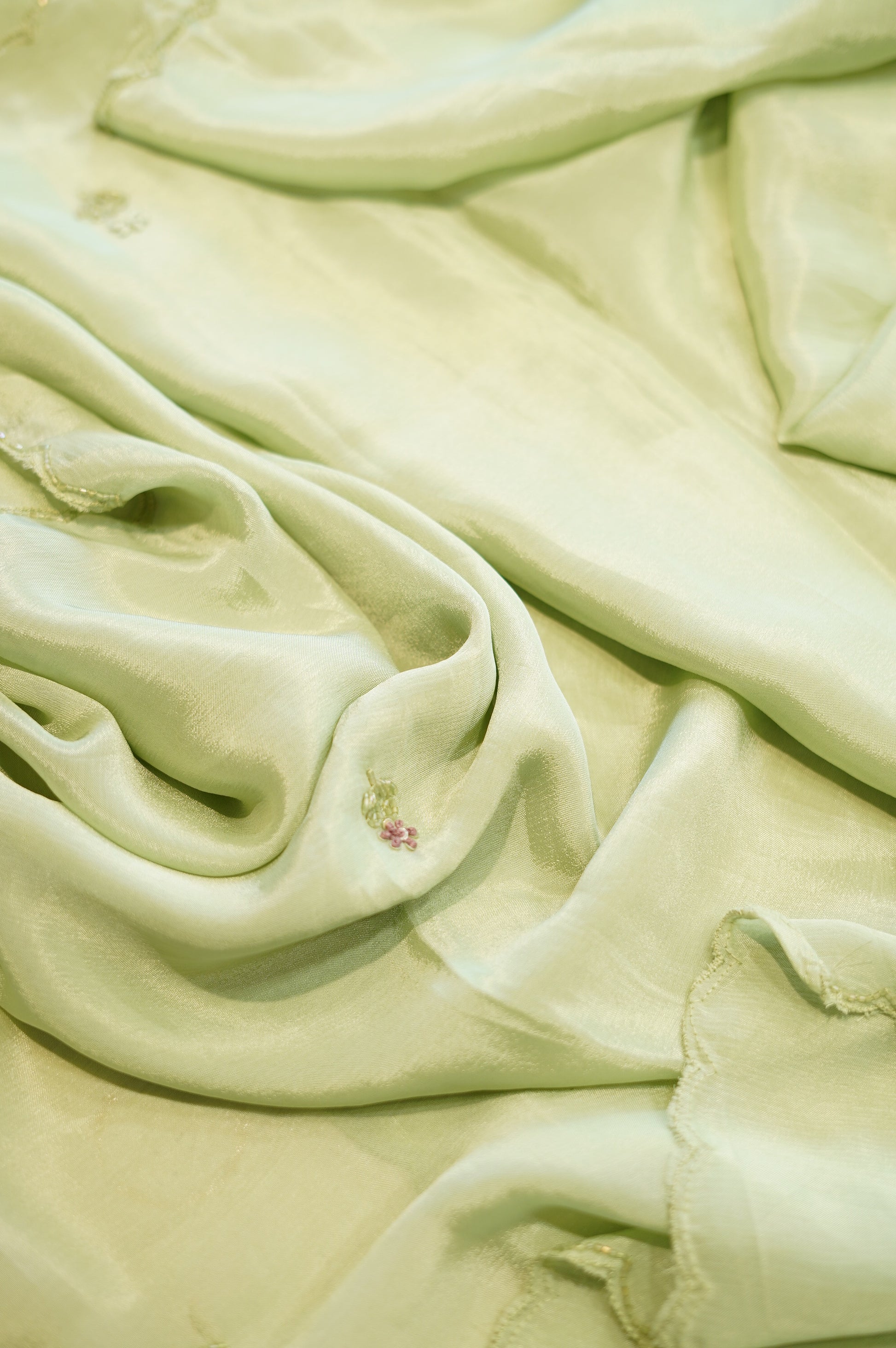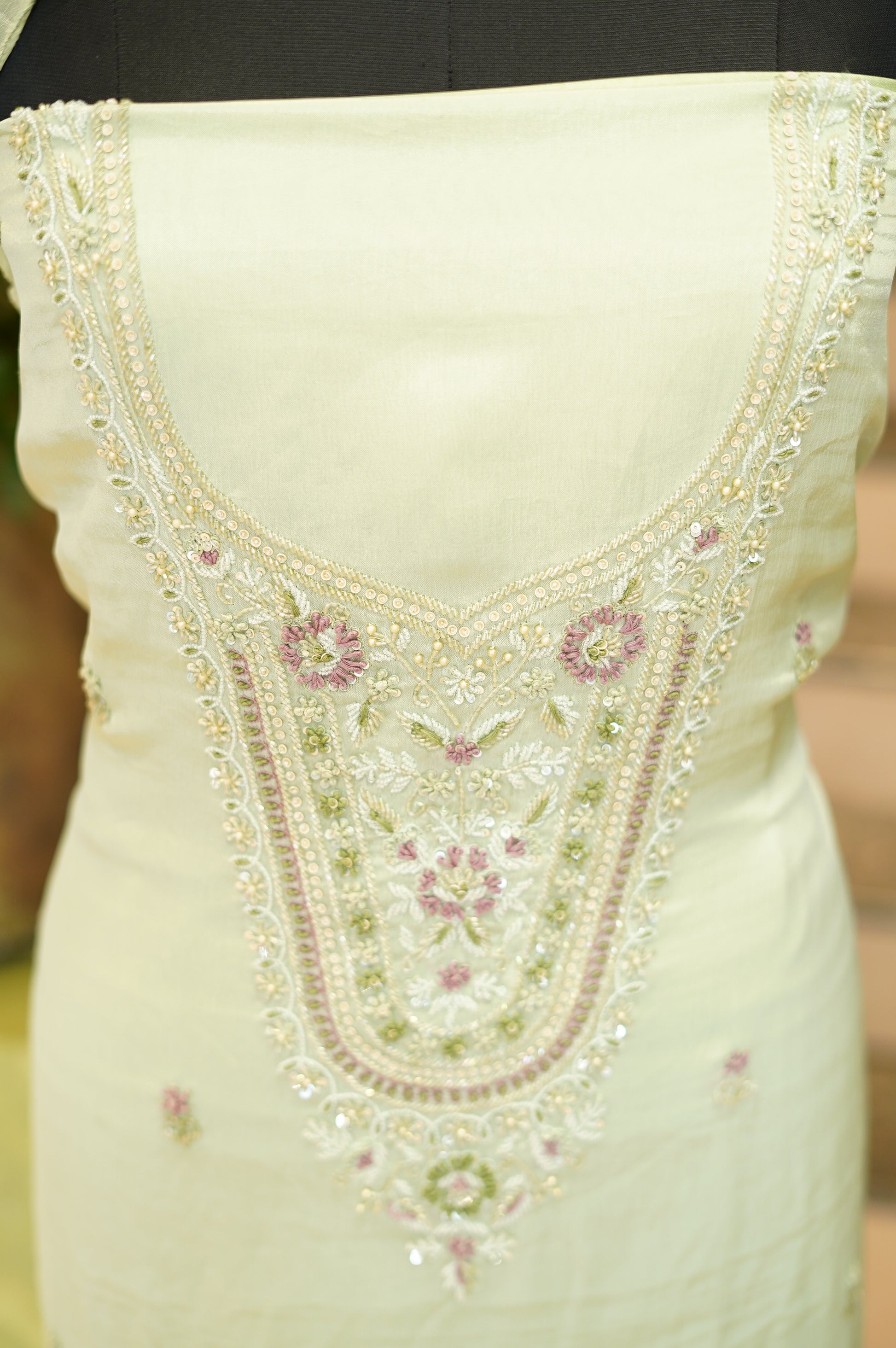 Radiate elegance with this Sea Green Chinon Suit, featuring delicate handwork that adds a touch of sophistication. Crafted from soft, flowing Chinon fabric, it is paired with a matching Chinon dupatta adorned with complementary handwork, creating a graceful and cohesive ensemble—perfect for festive occasions and formal gatherings.