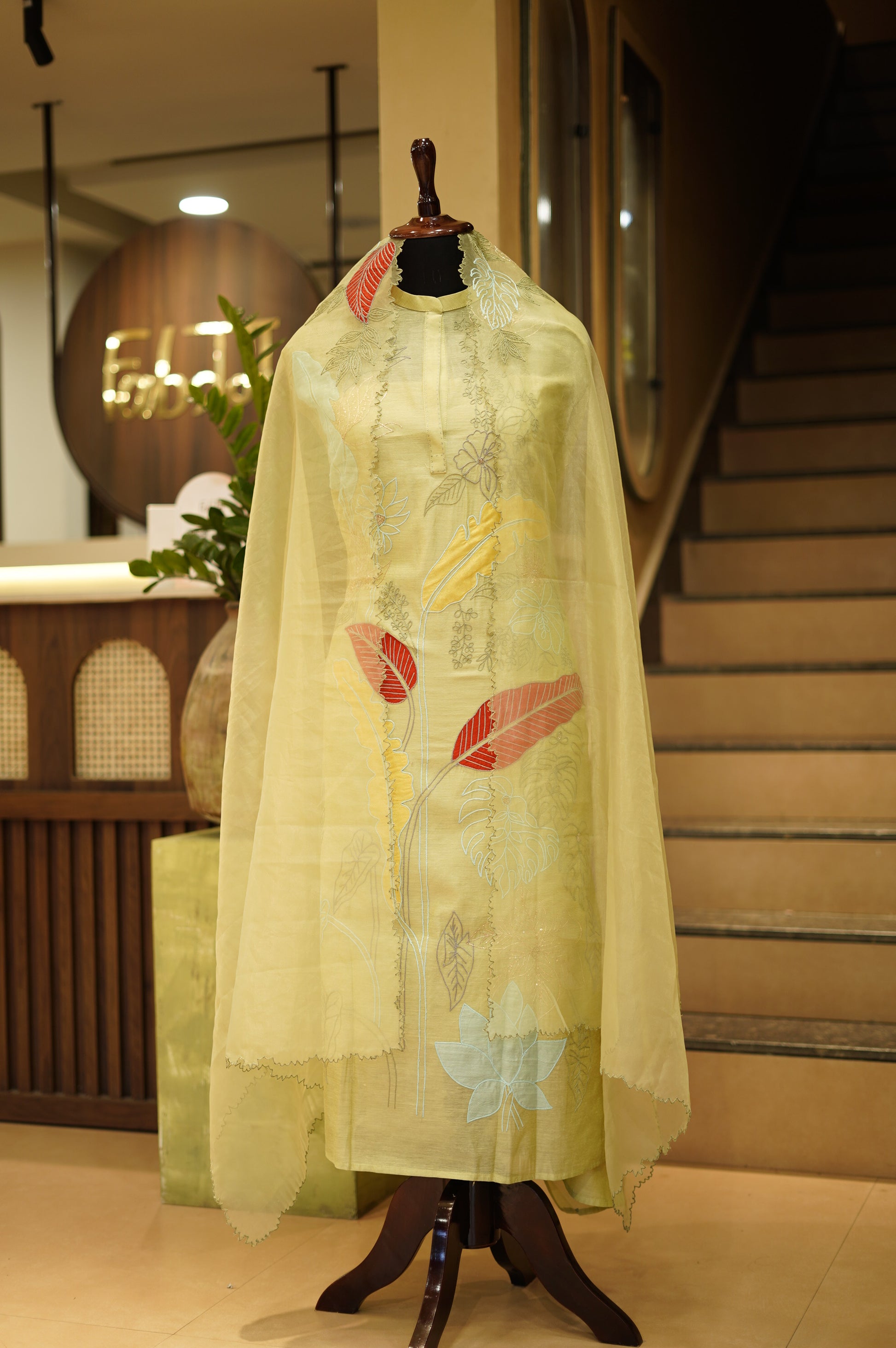 Step into elegance with this green Chanderi suit, featuring intricate embroidery and delicate appliqué work for a handcrafted, sophisticated finish. The lightweight, airy fabric drapes gracefully and is paired with a matching organza dupatta, creating a timeless ensemble perfect for festive occasions, weddings, or refined daytime events.