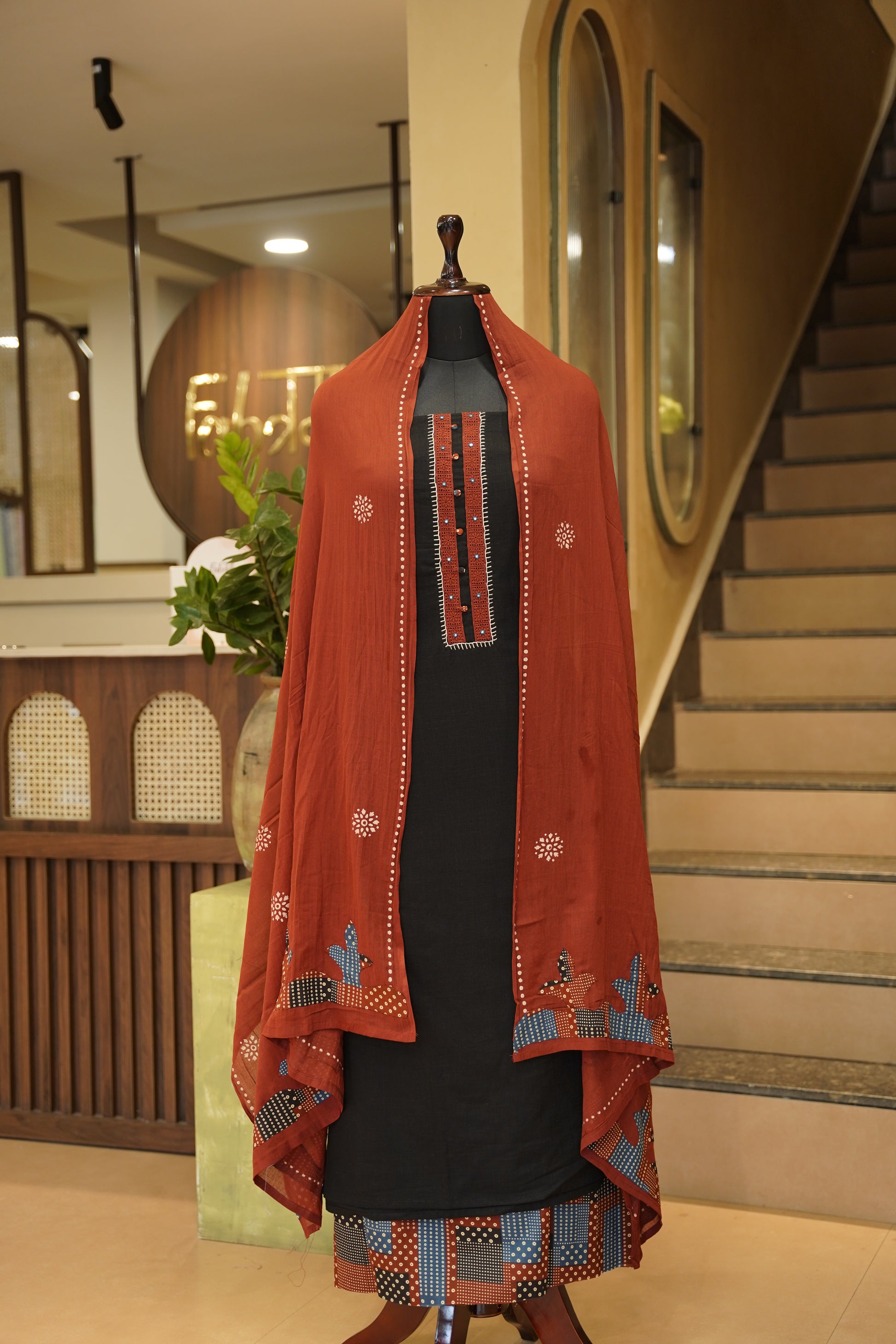 Classic and versatile, this black cotton suit features unique neck tie work, adding a stylish twist to a timeless silhouette—perfect for both casual and semi-formal wear.