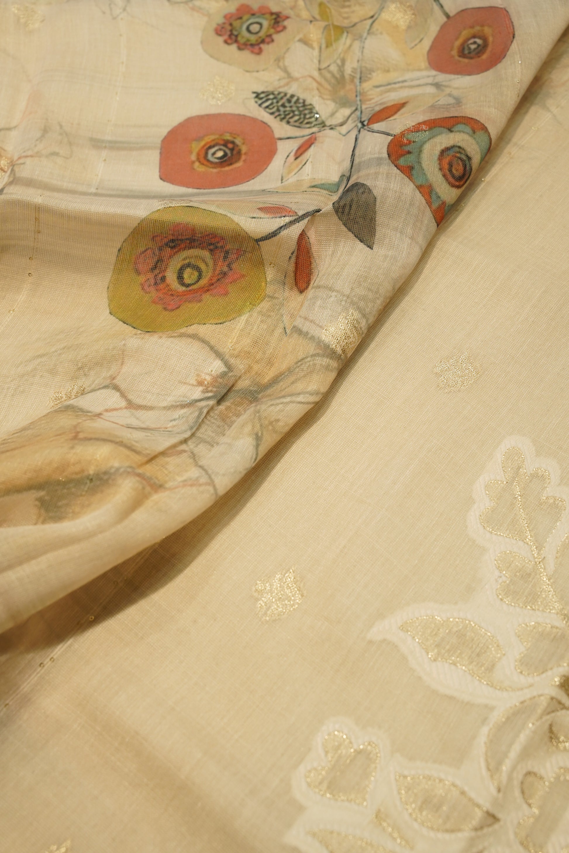Chic and comfortable, this cream slub linen suit features intricate gota work on the neckline, blending traditional craftsmanship with modern simplicity.