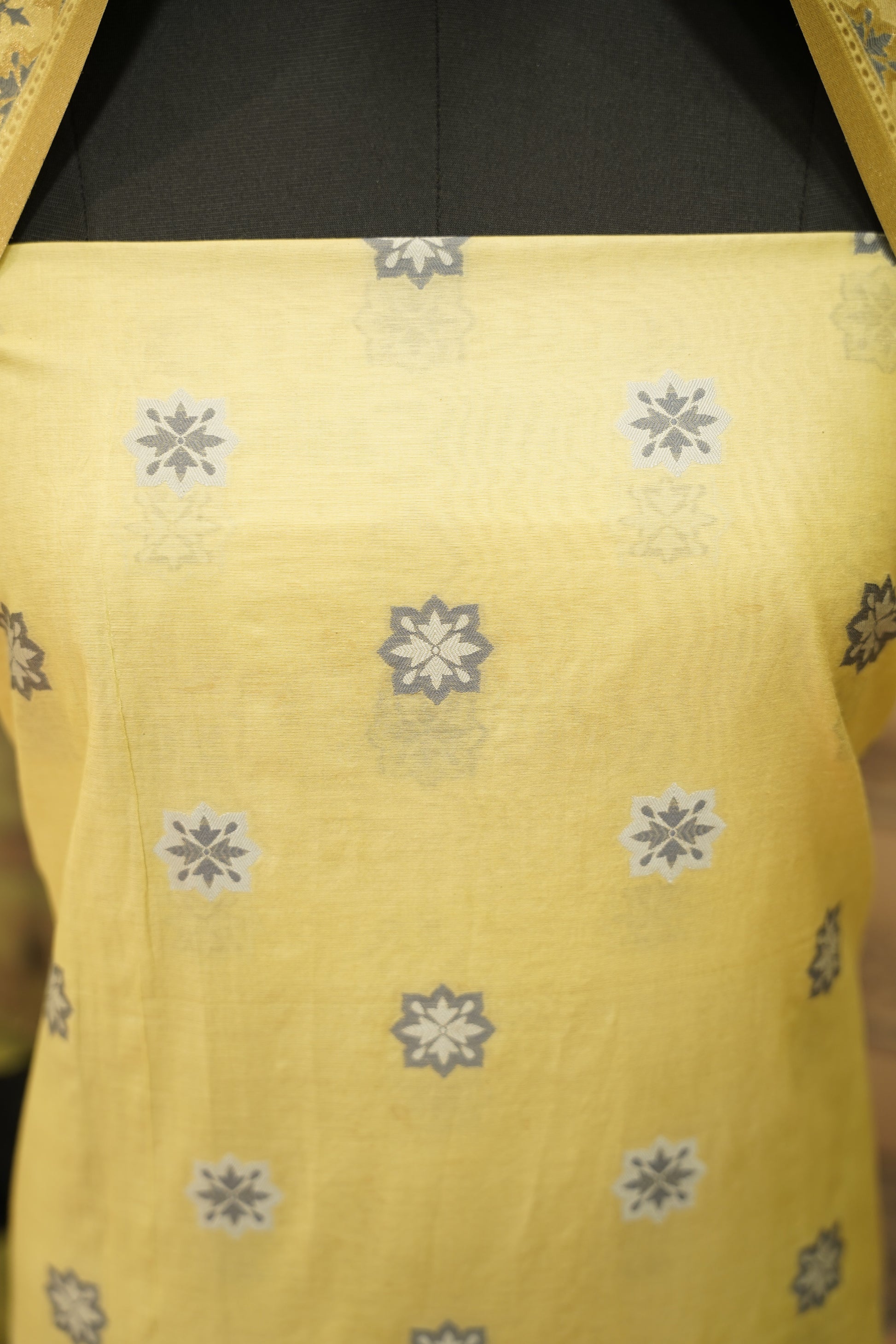 Elevate your ethnic wardrobe with this Mustard Pure Chanderi Jacquard Suit, featuring intricate jacquard weaving that adds texture and elegance. Paired with a matching jacquard Chanderi dupatta, this unstitched 3-piece set offers timeless style and luxurious comfort—perfect for festive occasions and celebrations.