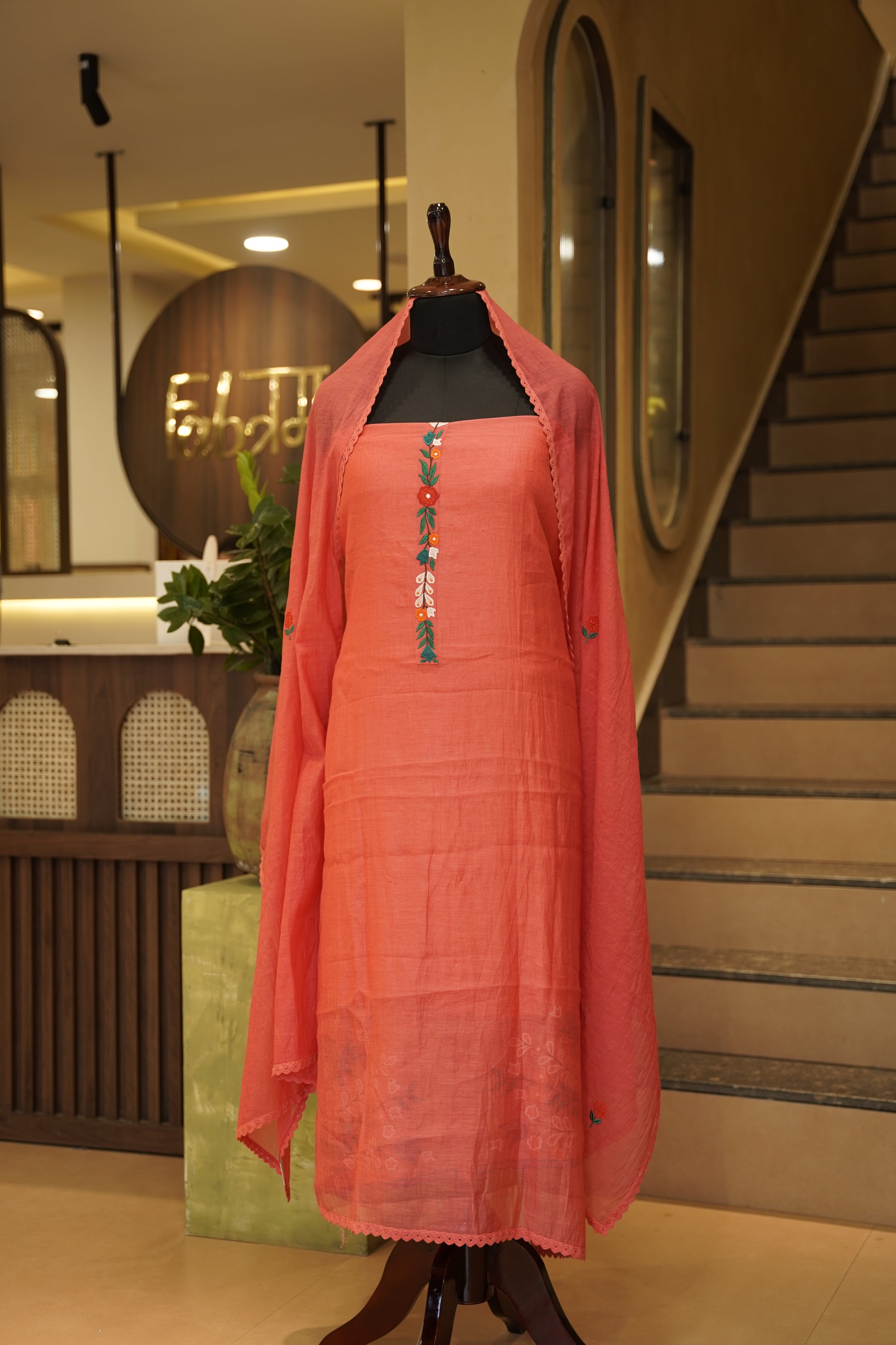 Brighten your wardrobe with this stunning 3-piece unstitched suit set crafted from soft tomato-colored Mul Chanderi fabric featuring exquisite appliqué work. Paired with a beautifully embroidered Mul Chanderi dupatta and matching pants fabric, this ensemble perfectly combines traditional artistry with contemporary charm—ideal for festive occasions and elegant gatherings.