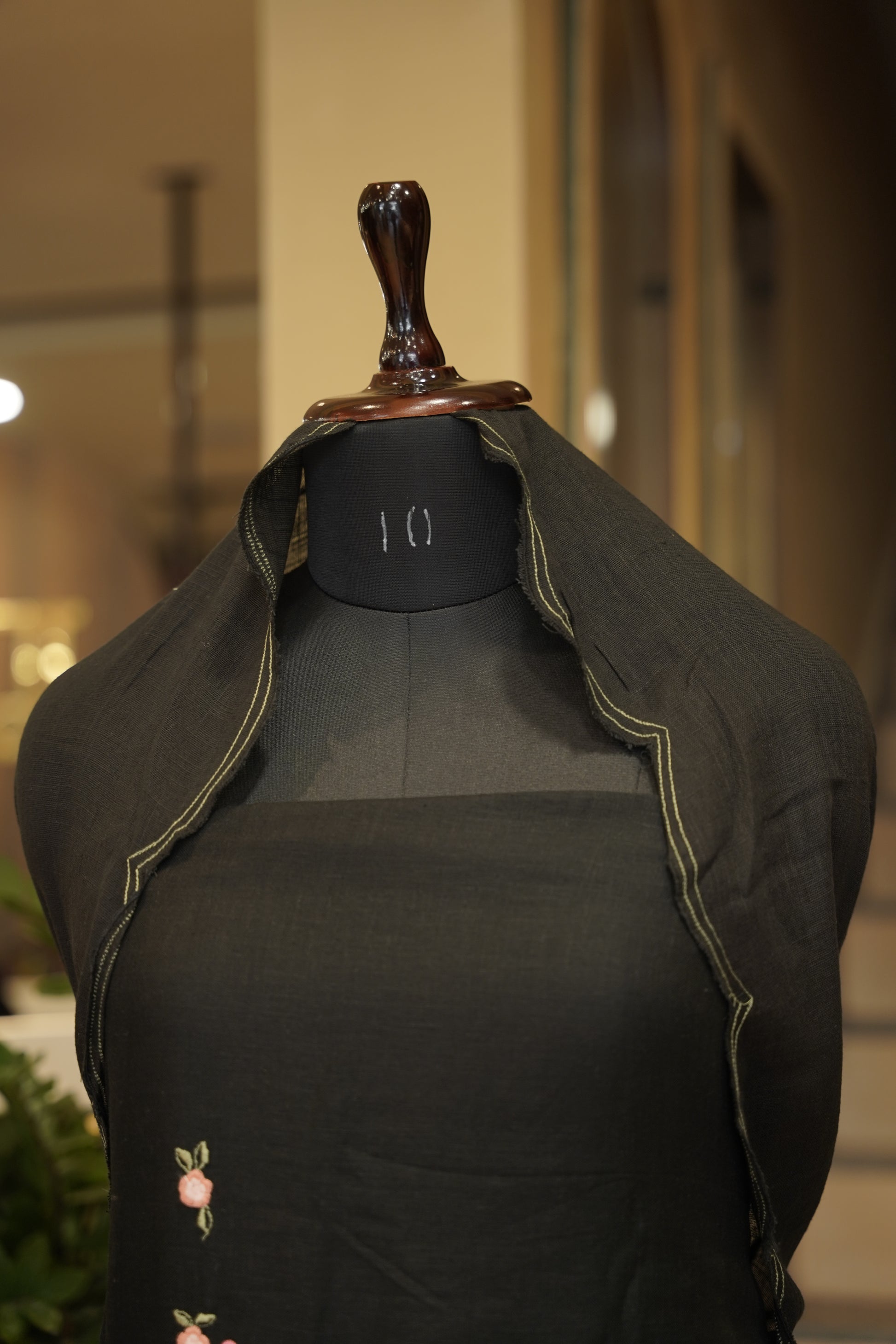 Sophisticated and timeless, this 3-piece unstitched suit set features luxurious black linen fabric adorned with delicate floral appliqué work. Paired with a matching appliqué dupatta and coordinating pants fabric, this ensemble is perfect for festive occasions, formal events, or stylish everyday wear.