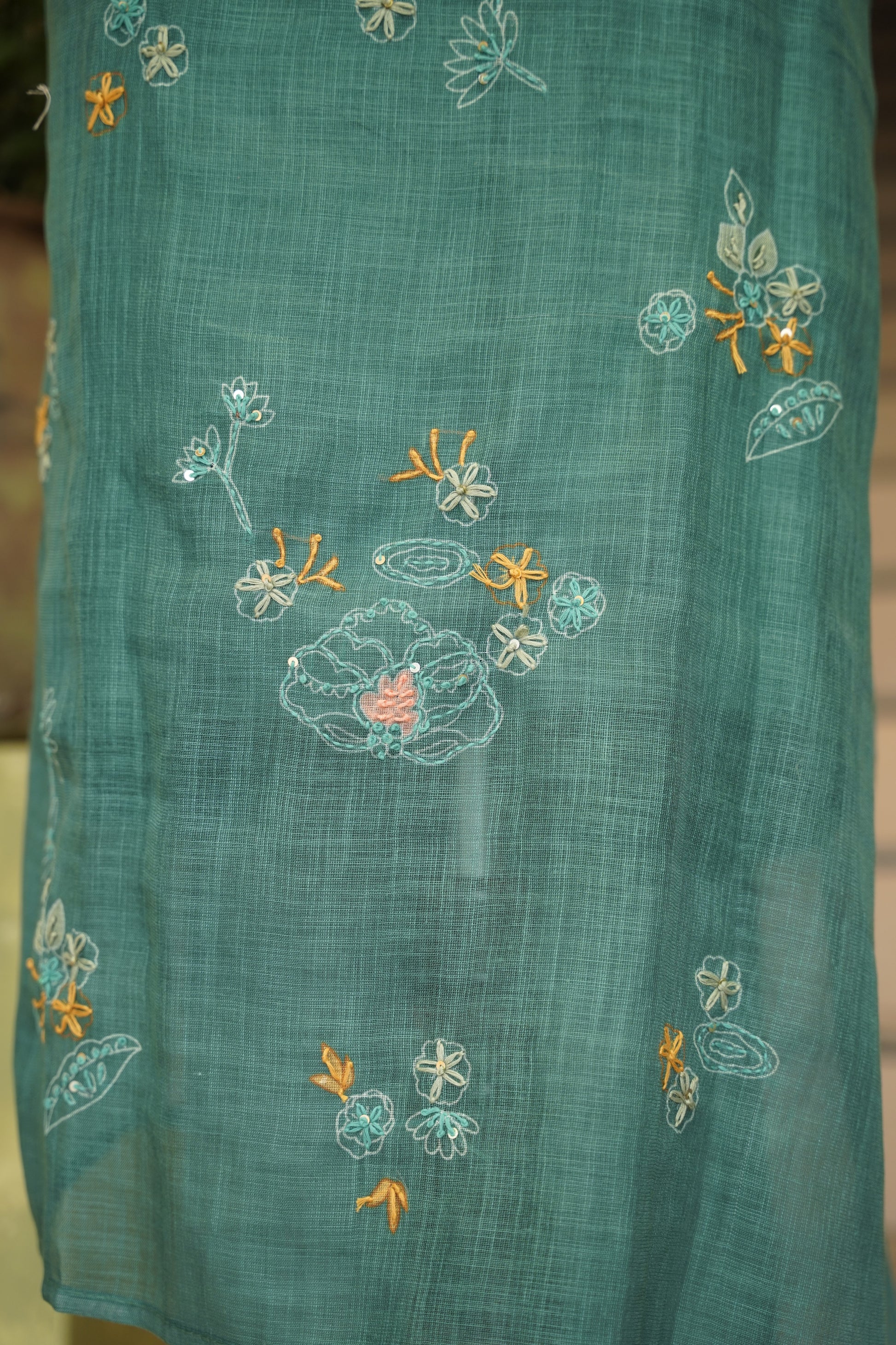 Fresh and elegant, this 3-piece unstitched suit set features soft green printed linen fabric enhanced with delicate hand embroidery for a refined touch. Paired with a beautifully hand-embroidered dupatta and coordinating pants fabric, this ensemble is perfect for festive occasions, casual gatherings, or sophisticated daywear.