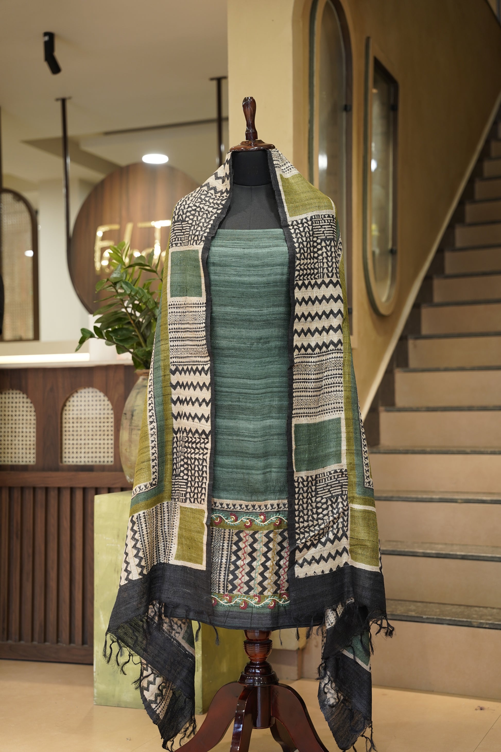 Green Pure Tussar Silk Printed Suit with Hand Katha Work