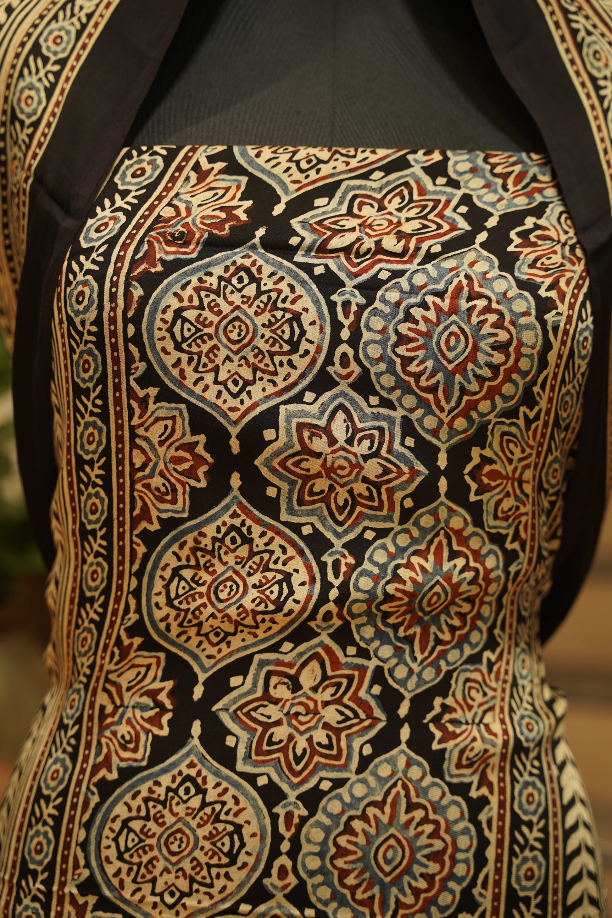 Bold and timeless, this 3-piece unstitched suit set features a classic Black Ajrakh suit paired with a matching Ajrakh printed dupatta and coordinating pants fabric. Perfect for cultural events, festive occasions, or elegant everyday wear, this set celebrates traditional craftsmanship with contemporary style.