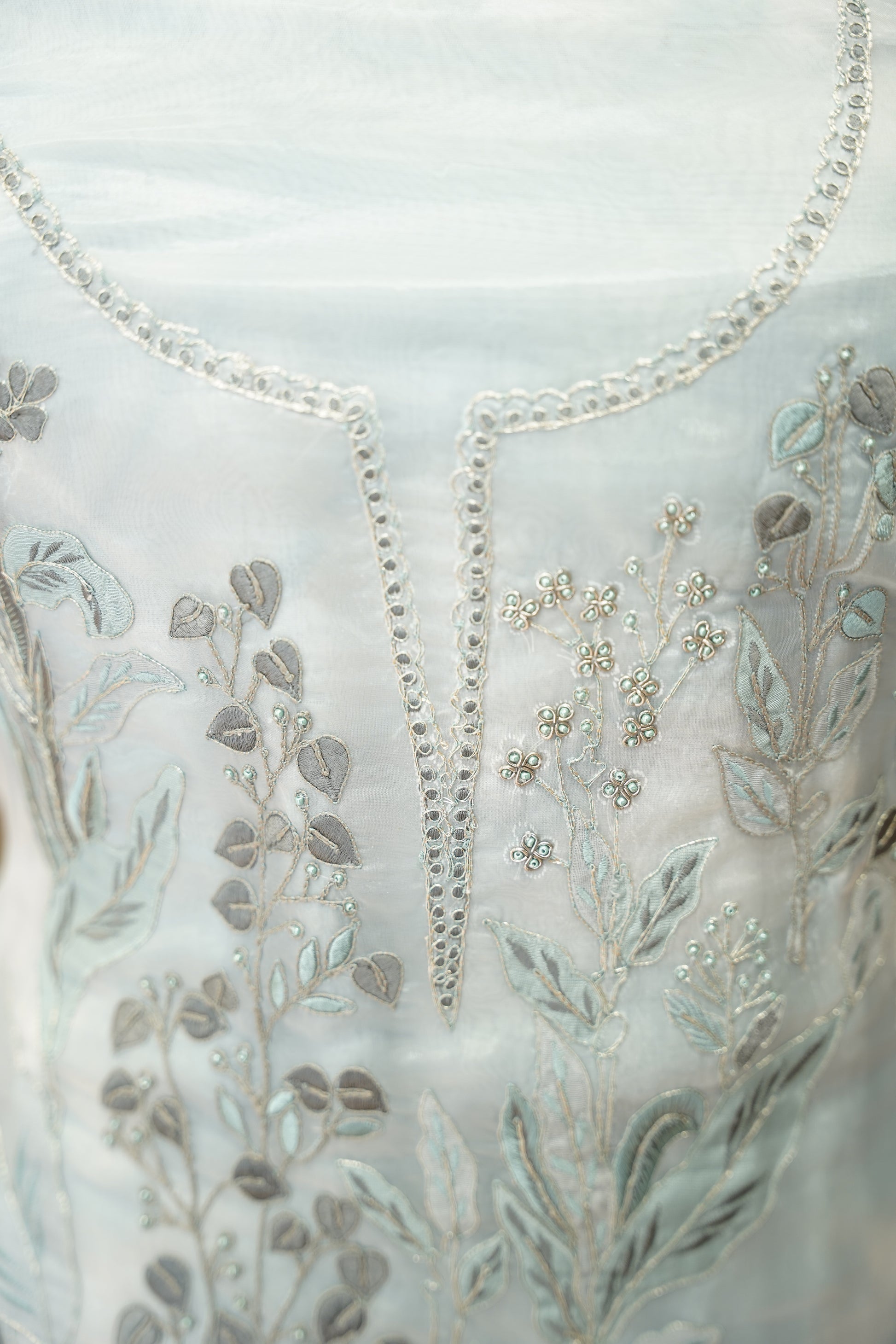 Elevate your style with this luxurious glass tissue suit featuring intricate neck embroidery. Lightweight and shimmering, it’s perfect for festive occasions and ready to be tailored to your fit.