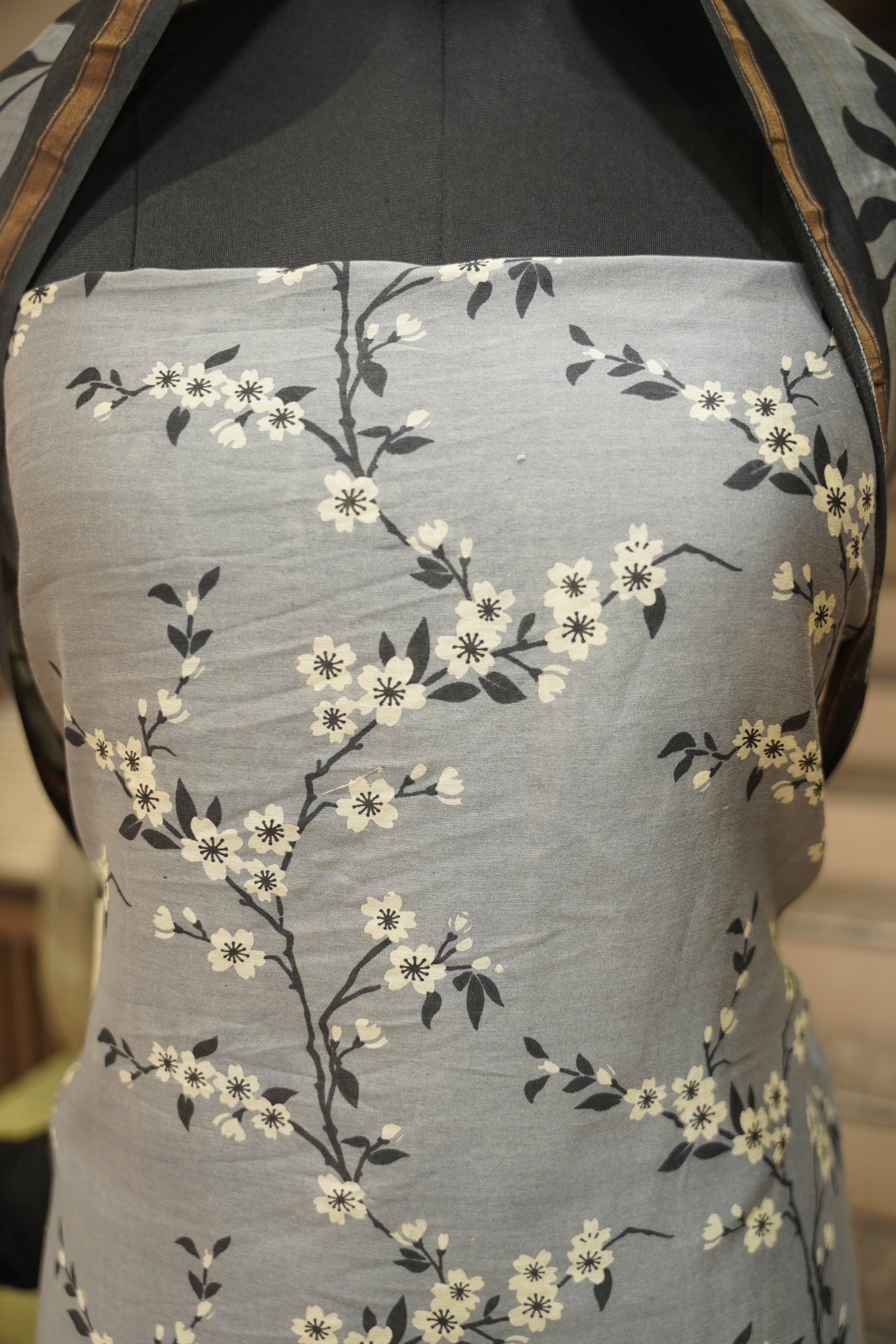 Elegant and understated, this grey pure Maheshwari suit features graceful prints on a lightweight, handwoven fabric. Its natural sheen and airy texture make it a perfect choice for both formal and casual occasions.