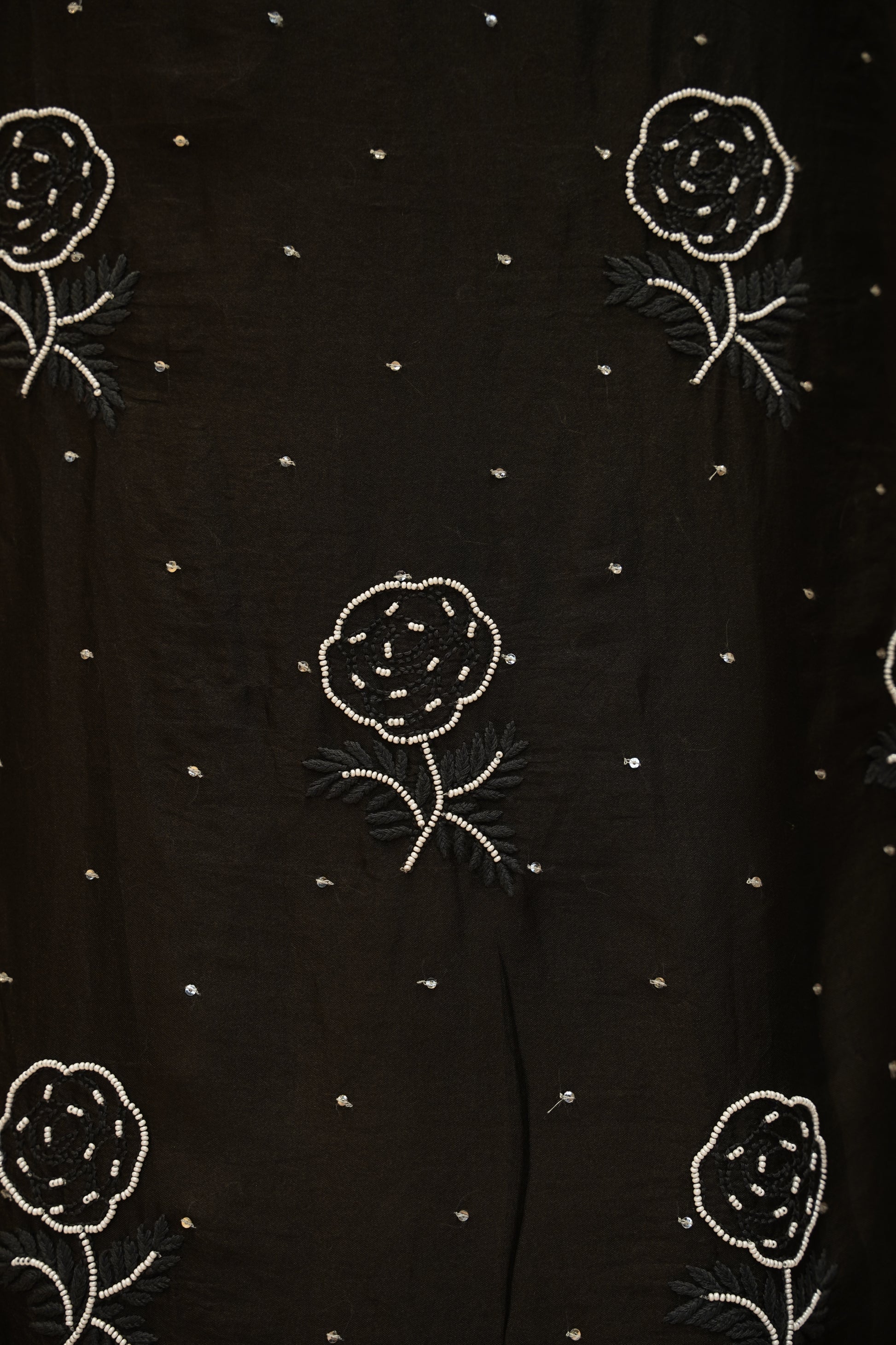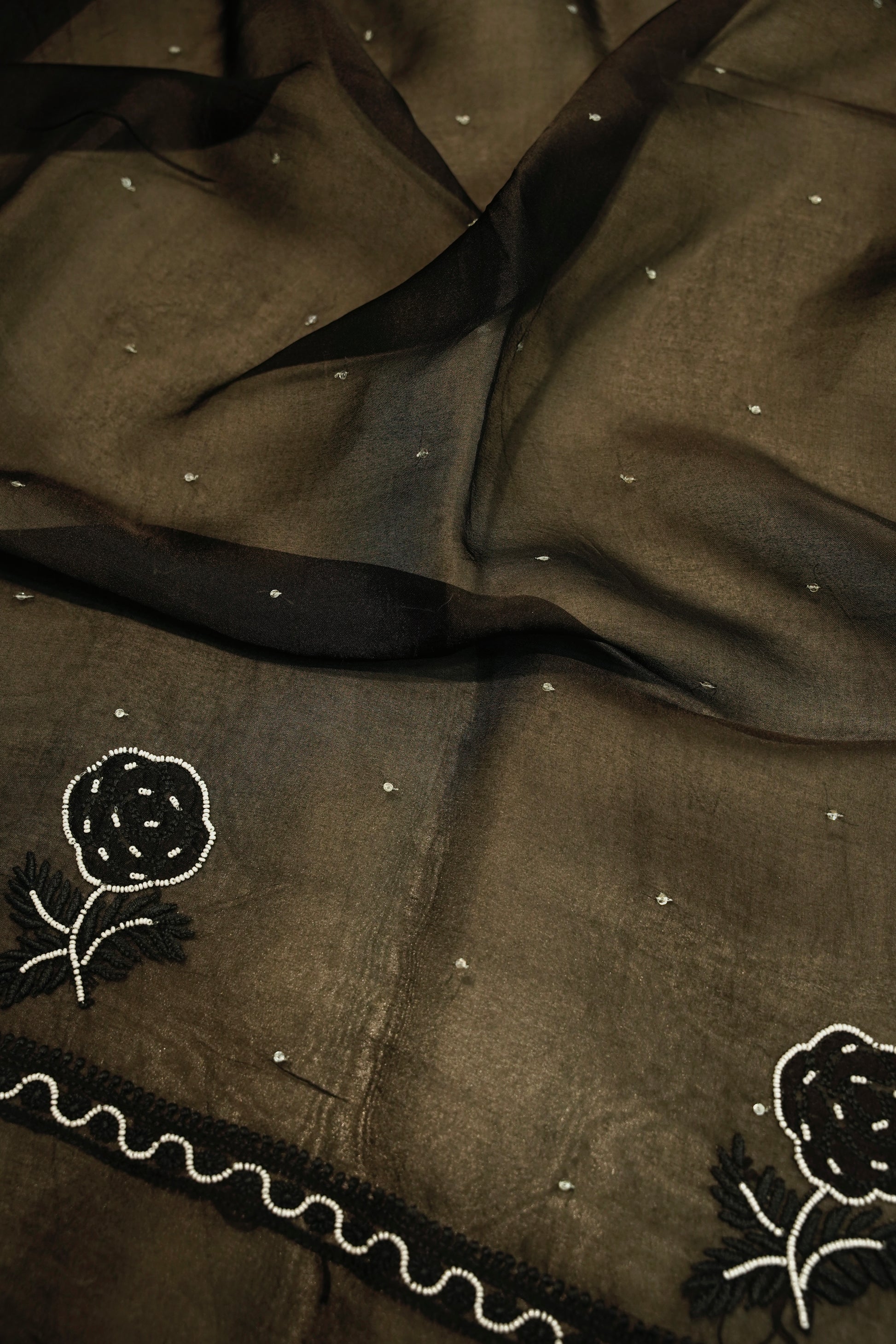 Make a sophisticated statement with this exquisite 3-piece unstitched suit set featuring a sheer Black Organza Lakhnavi suit adorned with delicate handwork. Paired with a matching Lakhnavi dupatta and coordinating pants fabric, this ensemble blends traditional artistry with contemporary elegance—perfect for evening events and special occasions.