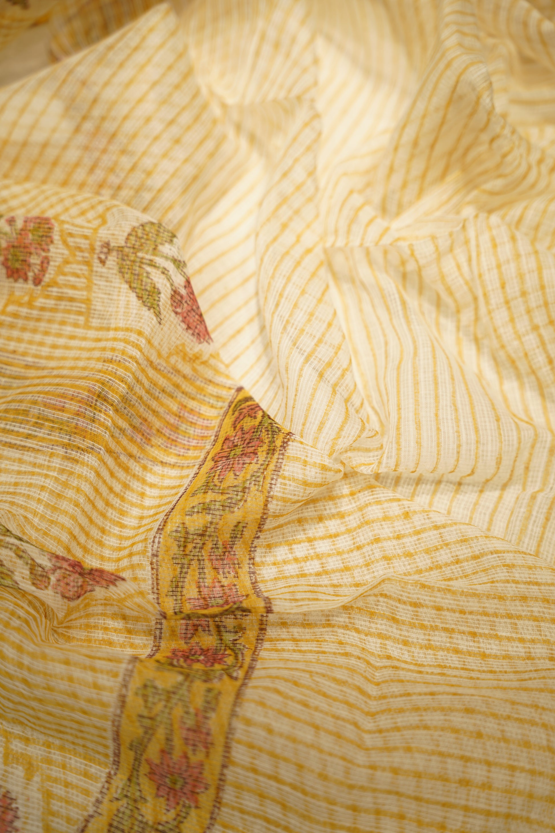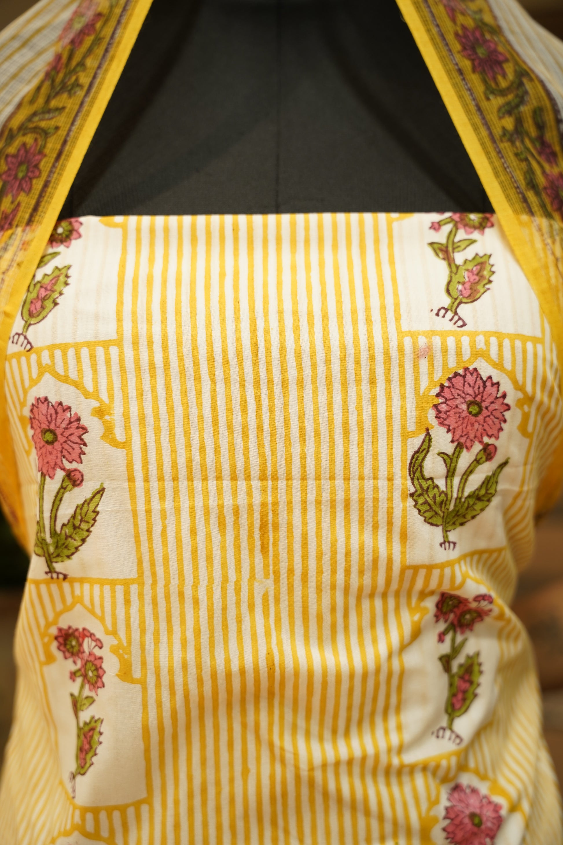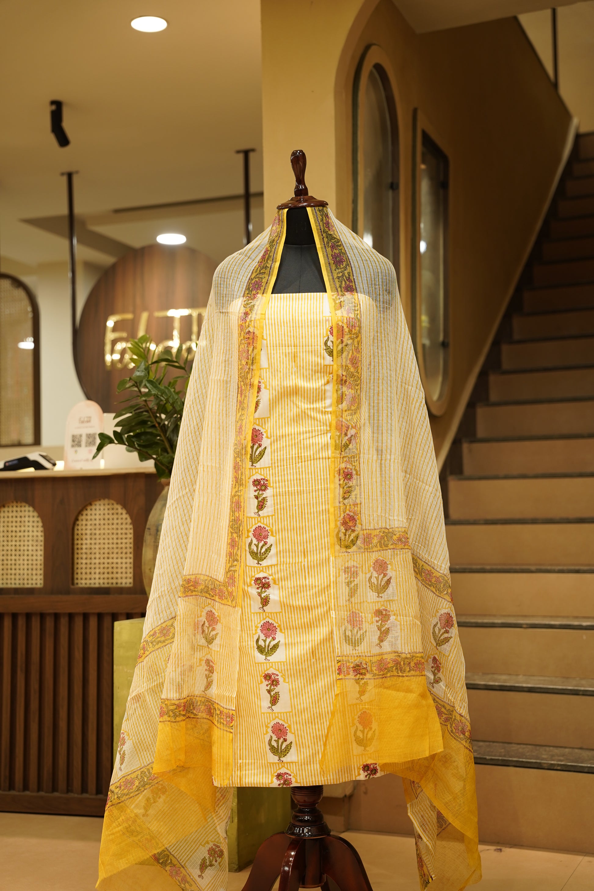 Brighten your wardrobe with this Yellow Pure Cotton Suit, featuring traditional hand block prints that bring a sunny charm to your look. Paired with a lightweight and airy Kota Doriya dupatta, this unstitched 3-piece set offers breathable comfort and ethnic elegance—perfect for festive days and casual outings.