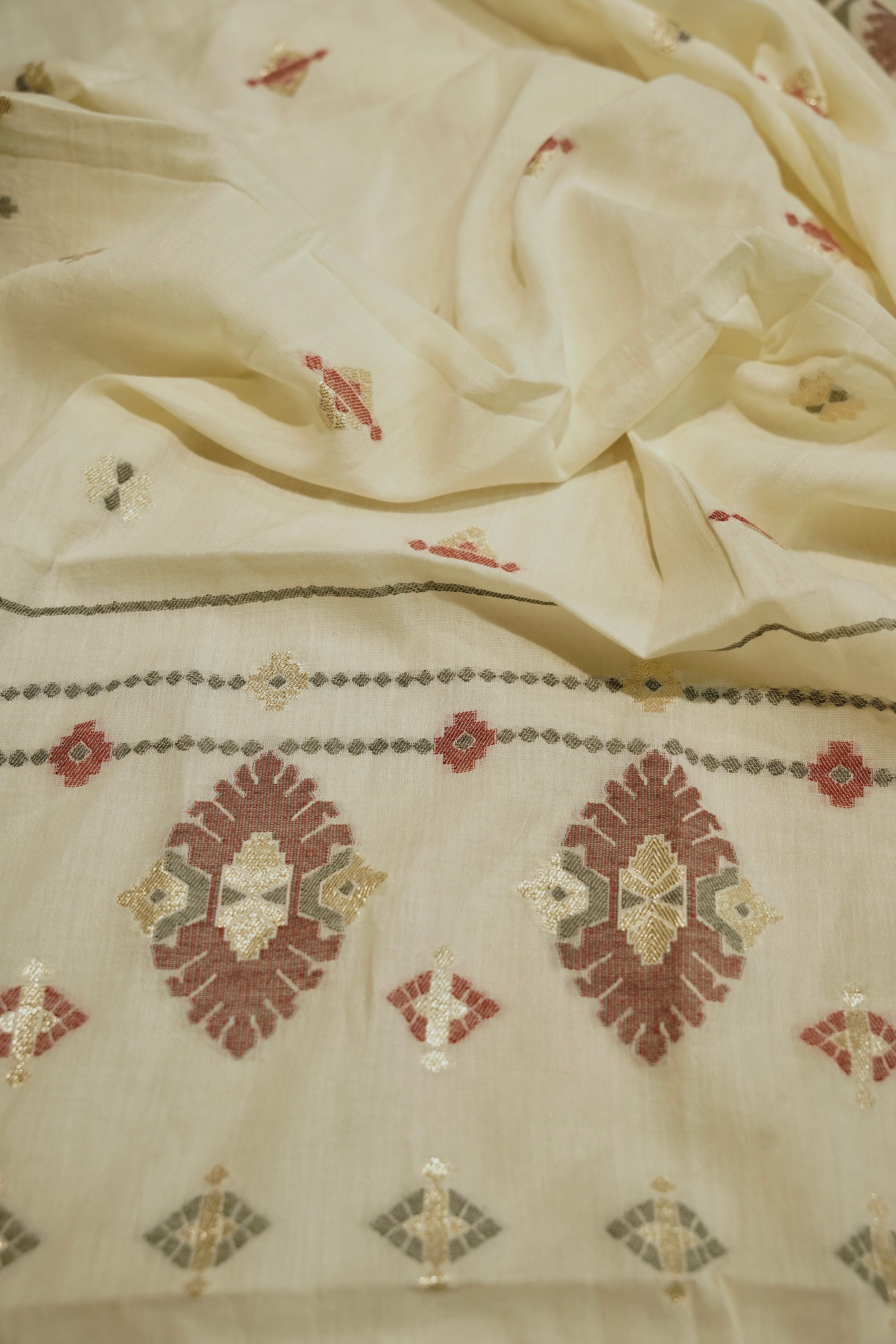 Gracefully timeless, this 3-piece unstitched suit set features a beautifully woven Off White Chanderi Jaamdani suit, showcasing intricate craftsmanship and delicate texture. Paired with a matching Jamdani Chanderi dupatta and pants fabric, this ensemble is perfect for festive occasions, cultural gatherings, or sophisticated daywear. A true celebration of heritage and elegance.