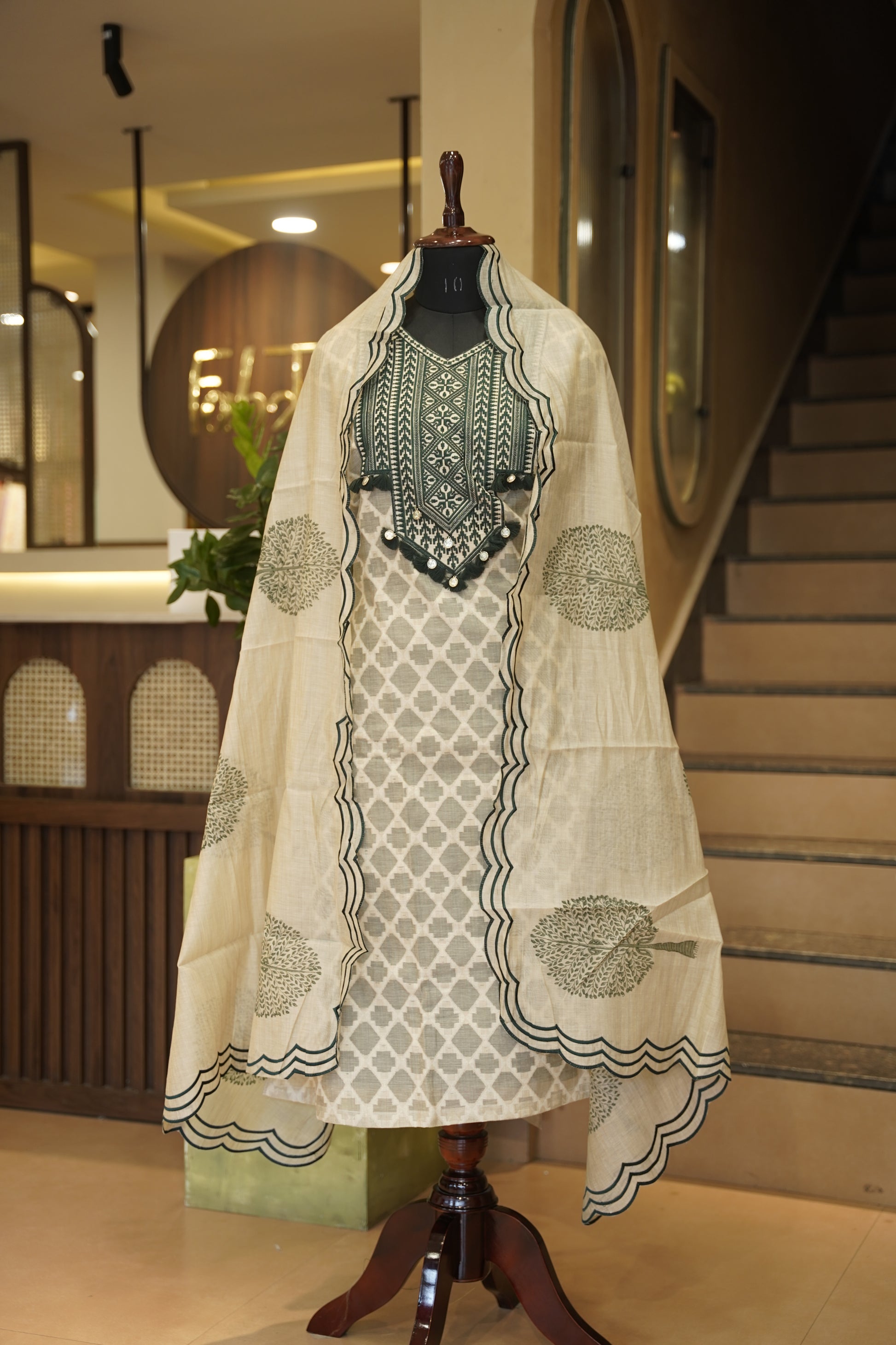 Understated and elegant, this 3-piece unstitched suit set features a soft Beige Self Chanderi suit enhanced with a beautifully crafted neck patch. It is paired with a coordinated block printed dupatta and matching pants fabric, offering a graceful look that’s perfect for festive events, casual gatherings, or elegant daywear.