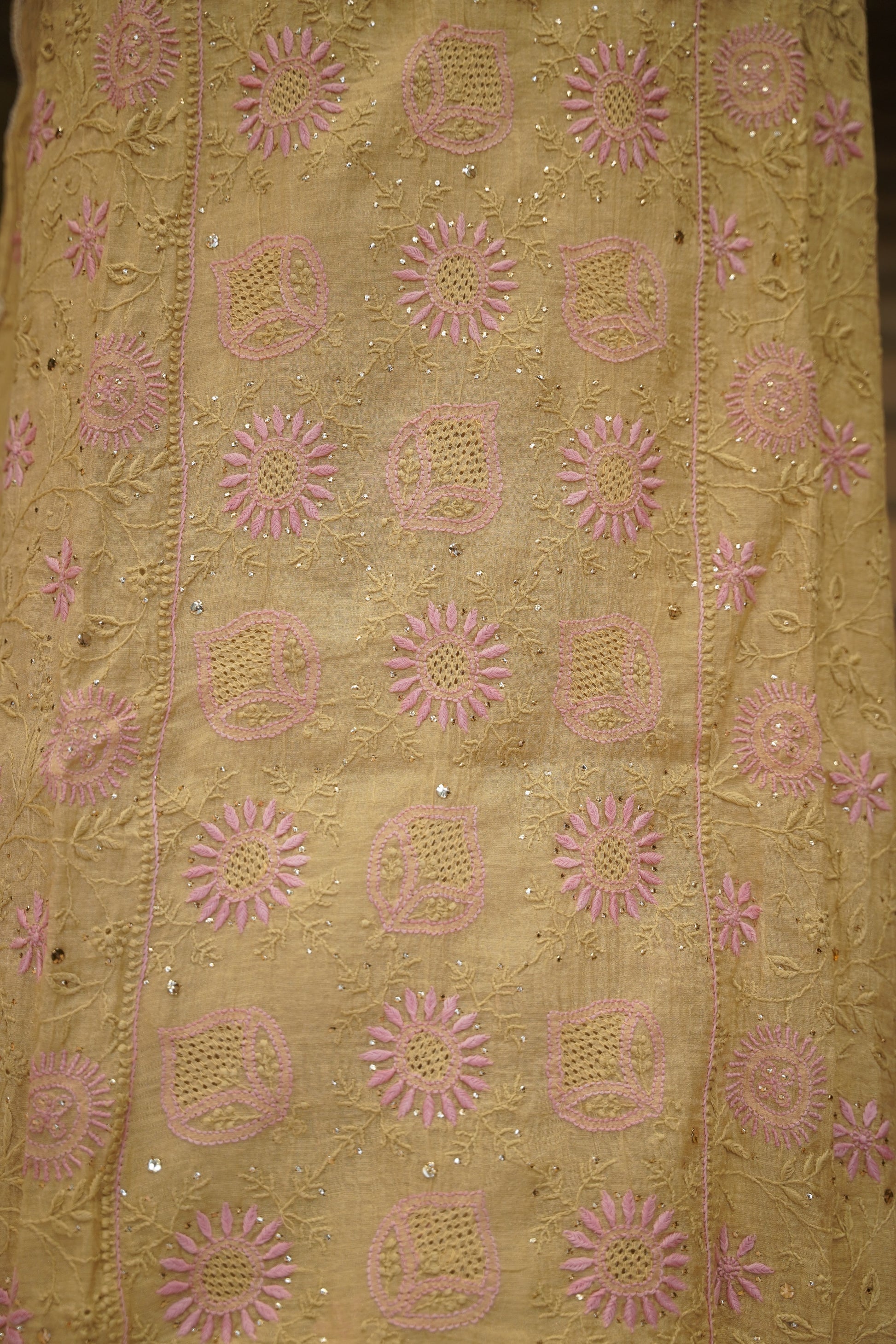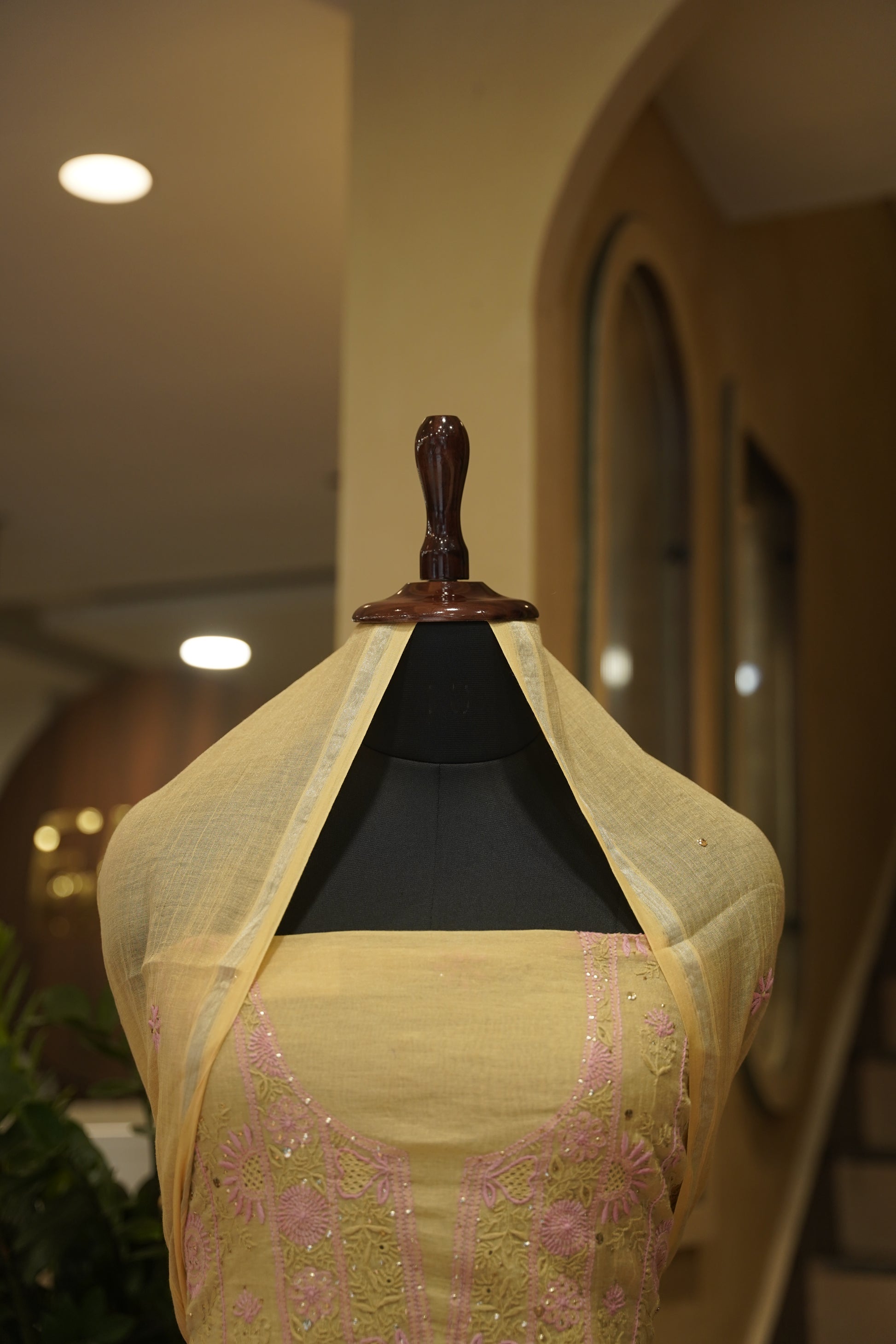 Make a statement in timeless elegance with this luxurious 3-piece unstitched suit set featuring a Pure Tissue Golden Lakhnavi suit. Rich in texture and intricate in design, this ensemble includes a delicately embroidered Lakhnavi top, paired with a matching dupatta and pants fabric. Perfect for festive celebrations, weddings, or evening gatherings, this suit embodies grace, heritage, and sophistication.