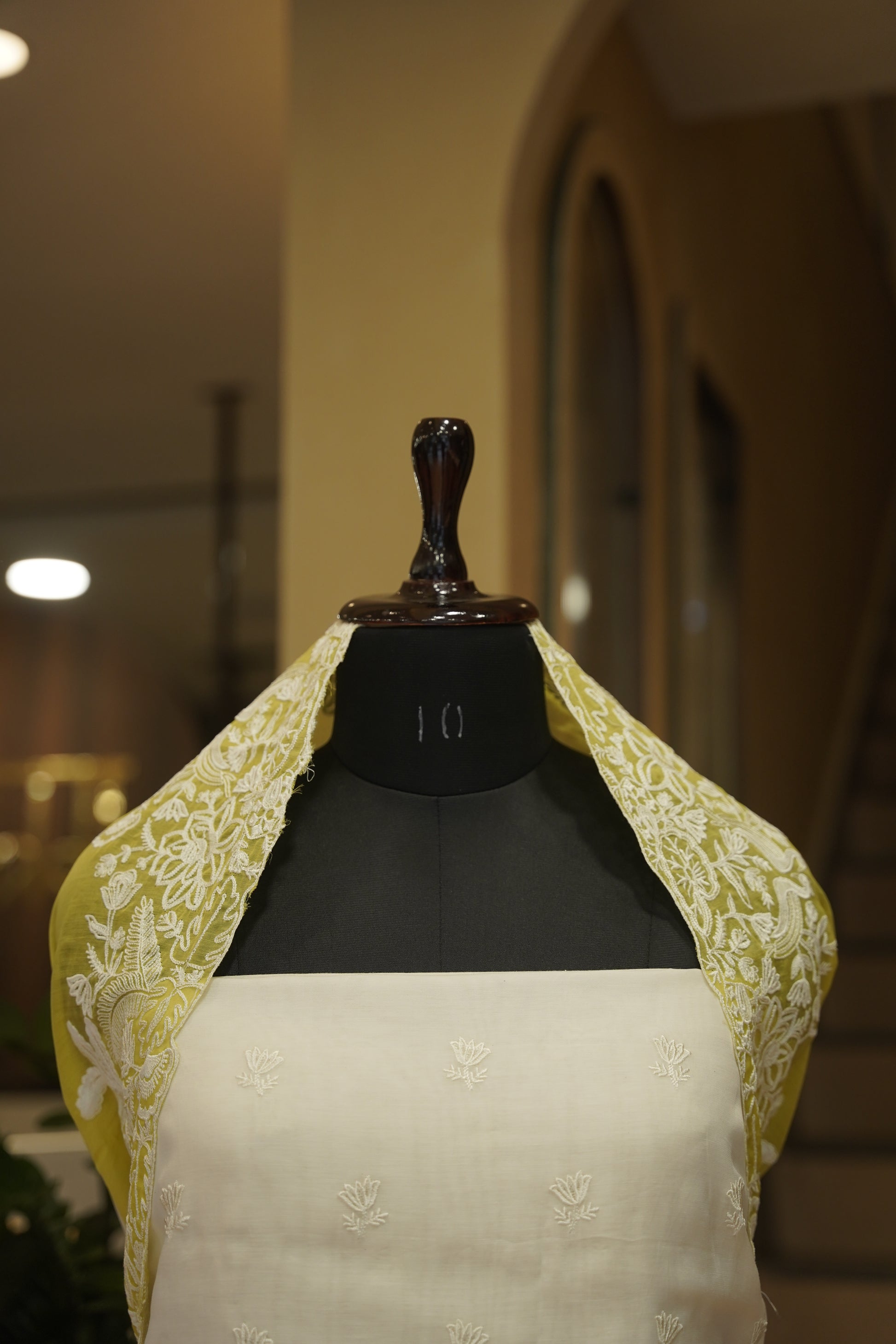 Step into subtle elegance with this beautiful 3-piece unstitched suit set featuring a soft and breathable Embroidered Mul Chanderi suit. Paired with a delicate embroidered dupatta in a graceful blend of white and yellow, along with matching pants fabric, this ensemble is perfect for festive occasions or daytime gatherings. A timeless fusion of comfort, color, and craftsmanship.